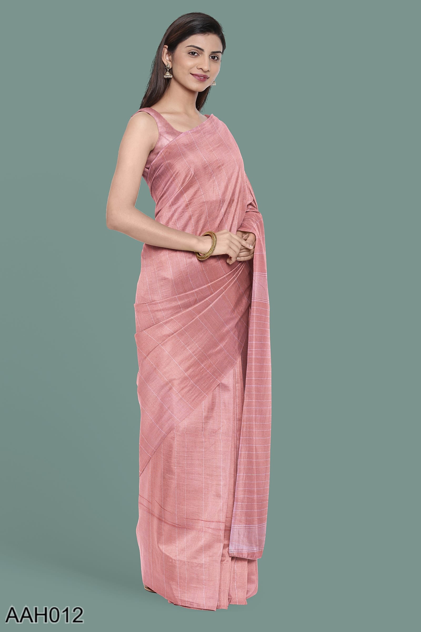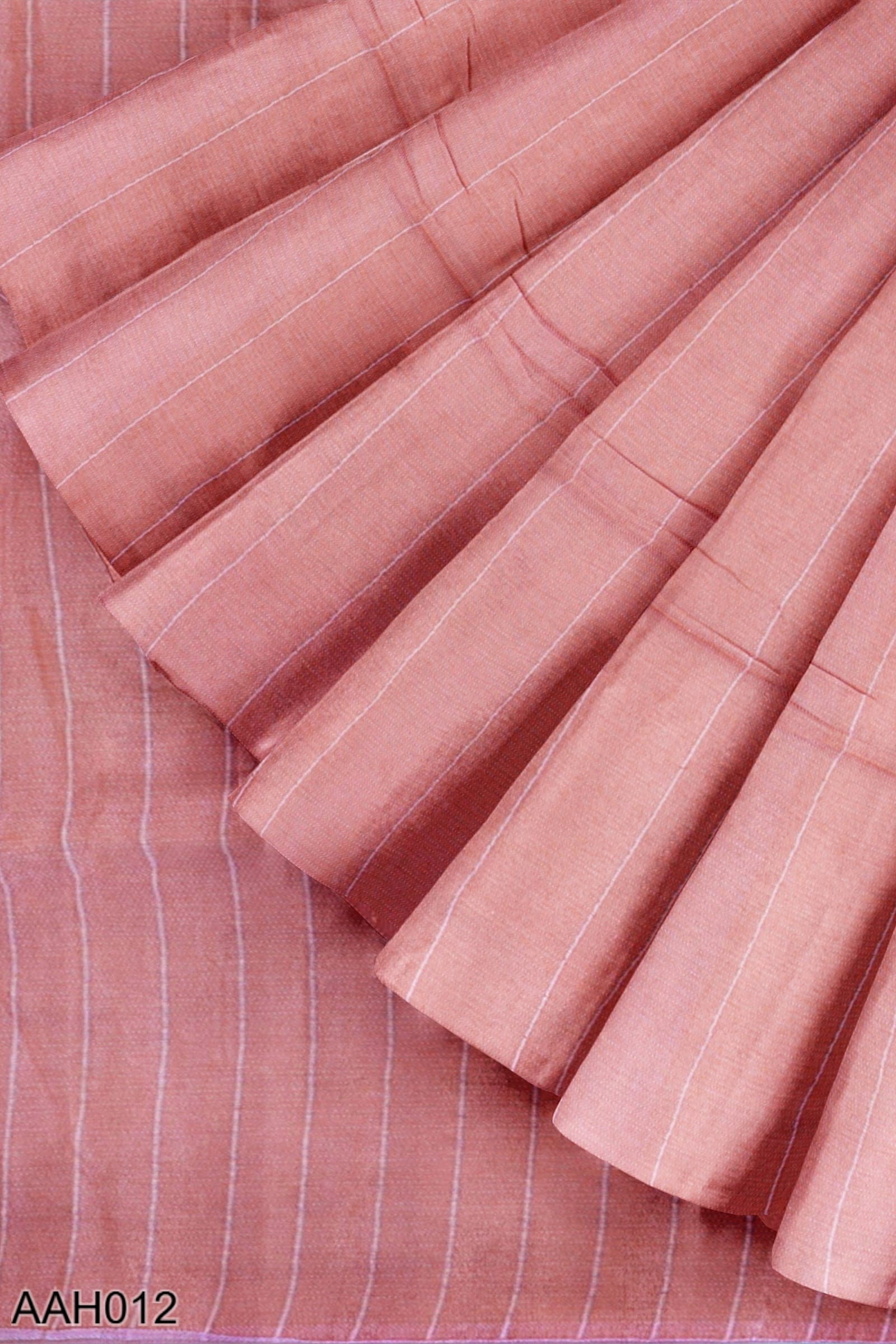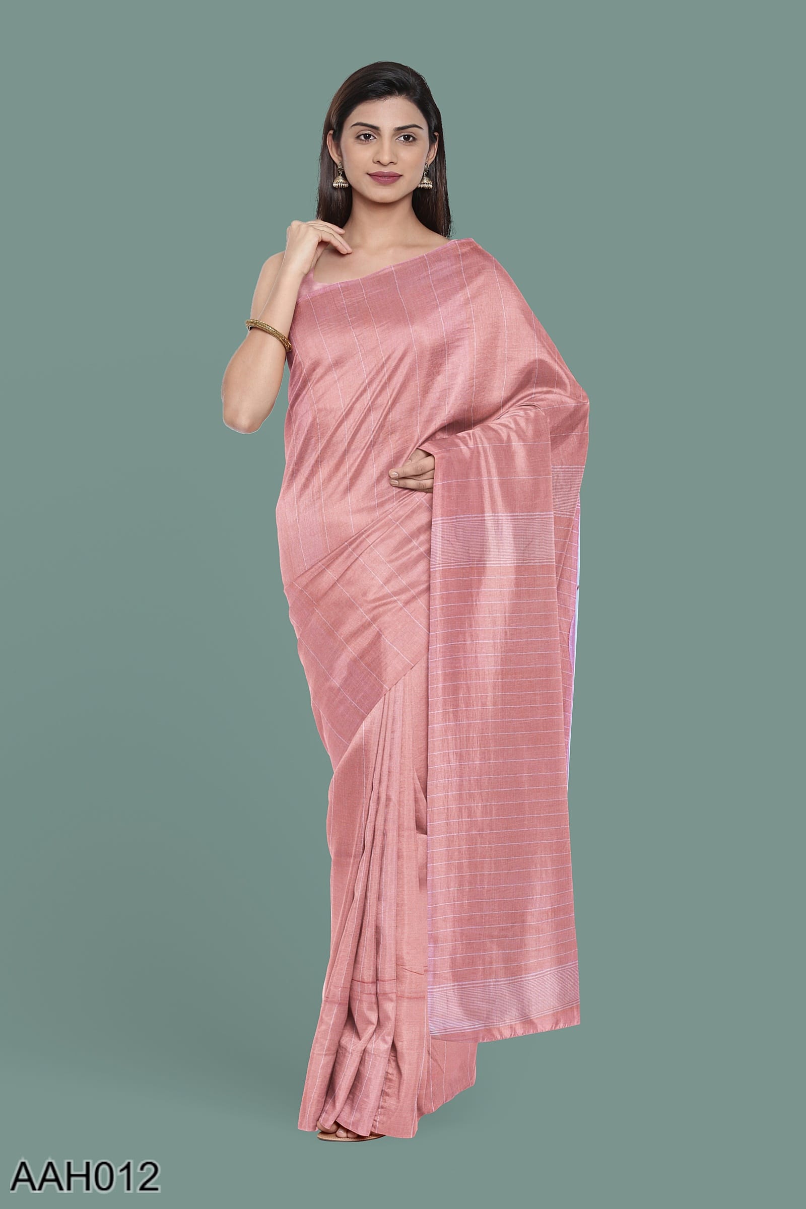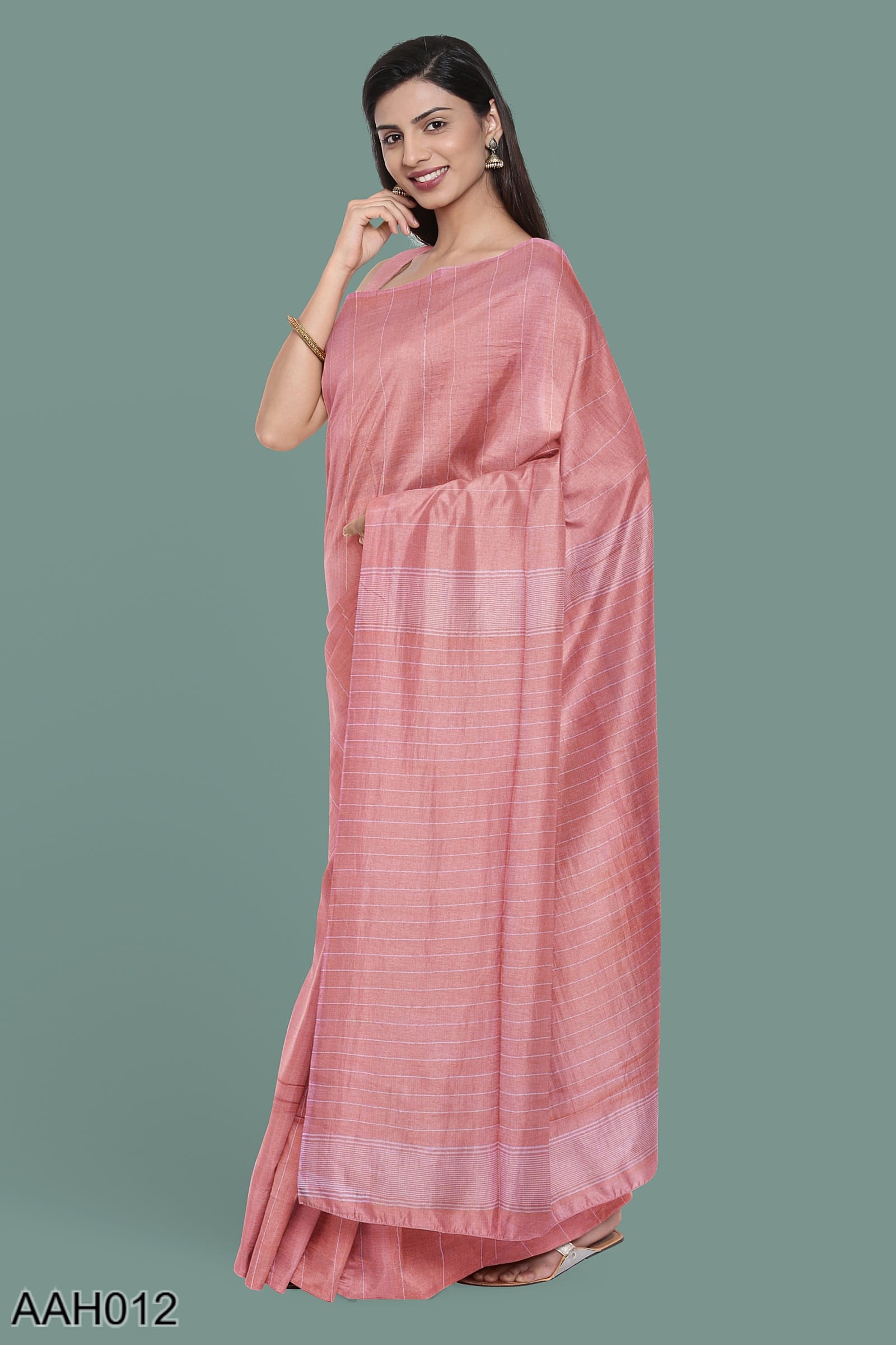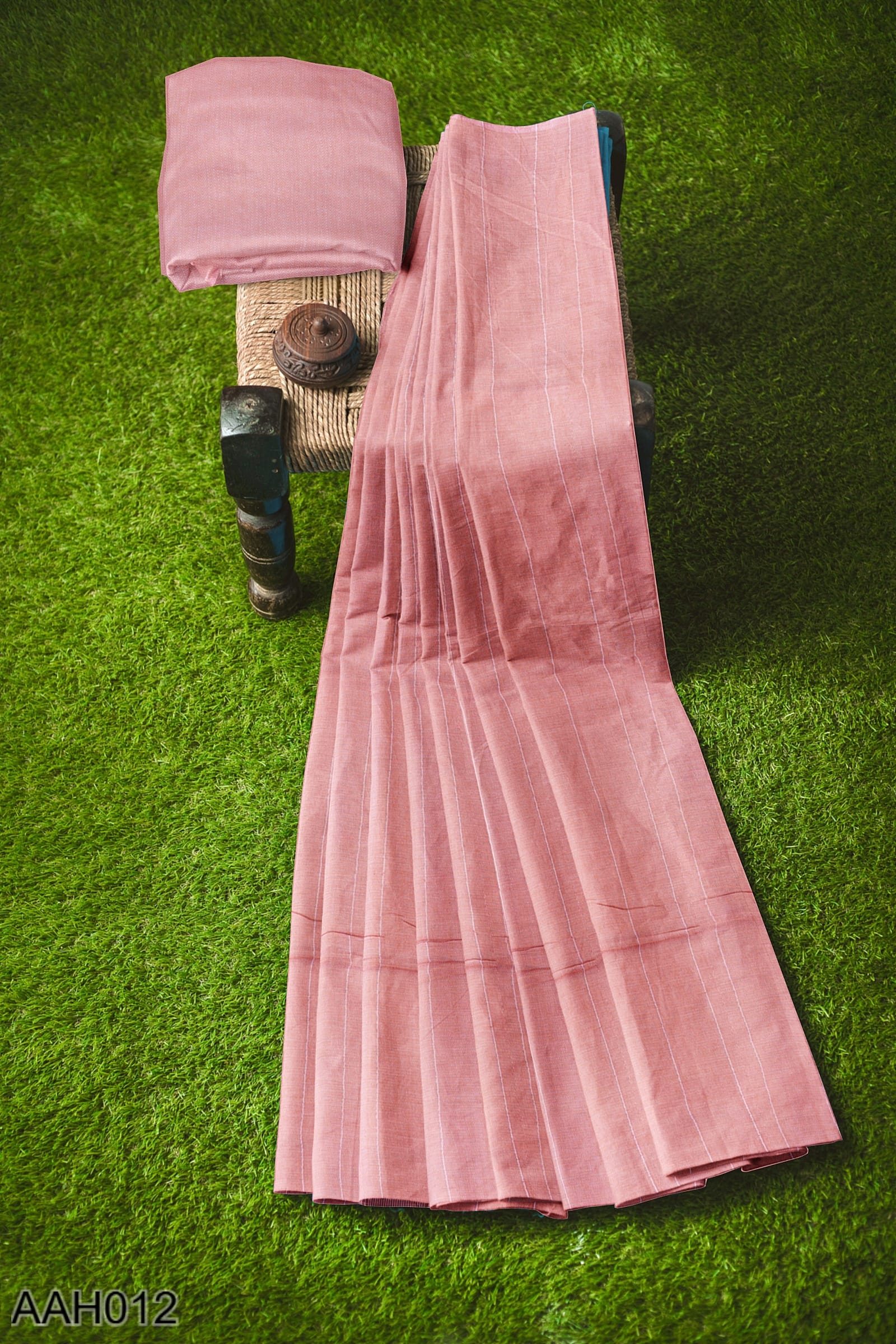 Flamingo pink cotton saree with vertical stripes and a Nakhi Poth border. The body carries a 4-peddle self-woven design that feels grounded and textural. With no blouse motifs and a clean pallu, this is a graceful pick for temple wear or summer dressing in soft shades.