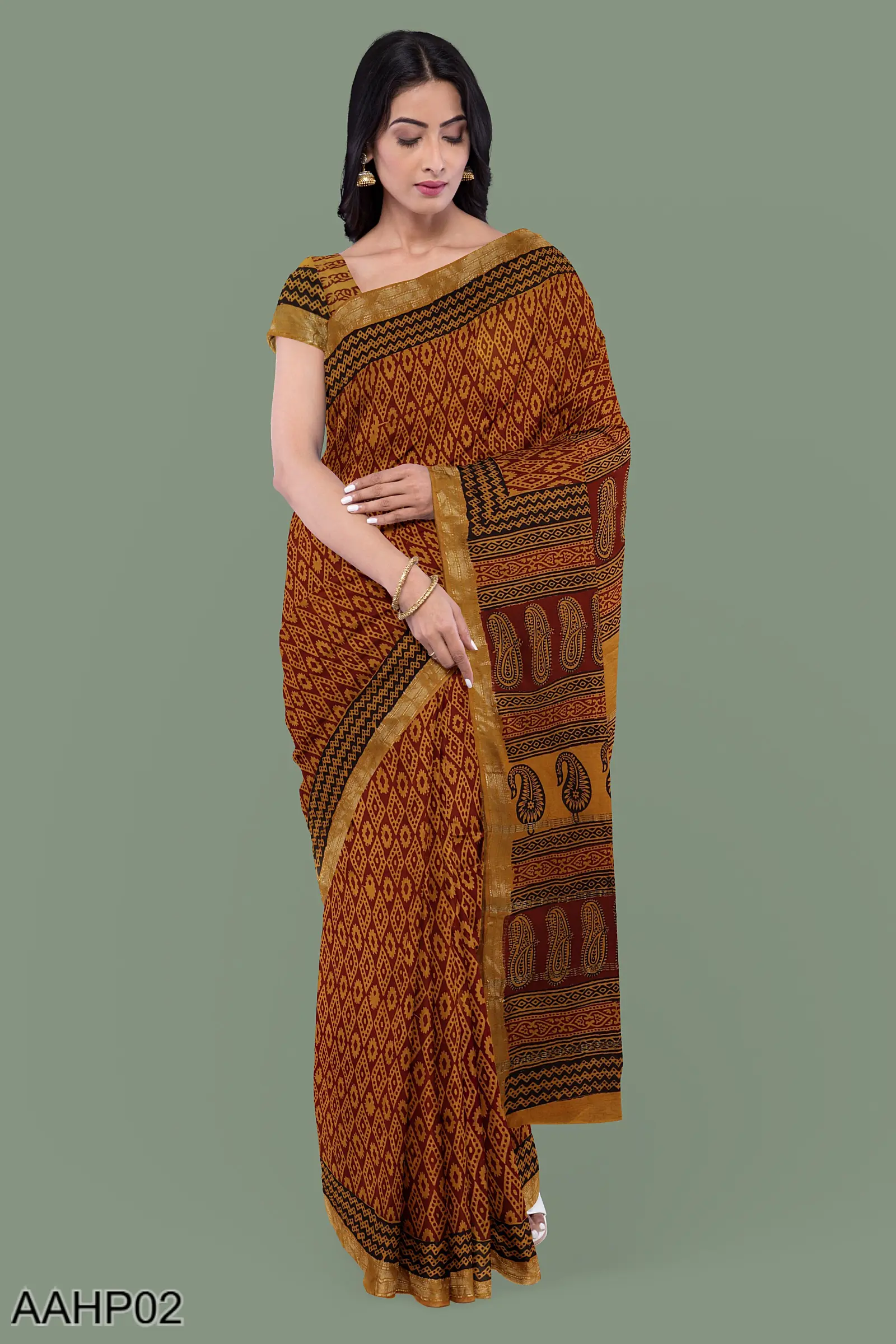 Light brown silk cotton saree with a Lehar border and running blouse. Bagh handprints span the body and pallu, adding depth without contrast. The tones are grounded, the fall clean. Ideal for cultural gatherings, home pujas, or moments that call for tradition in a modern frame