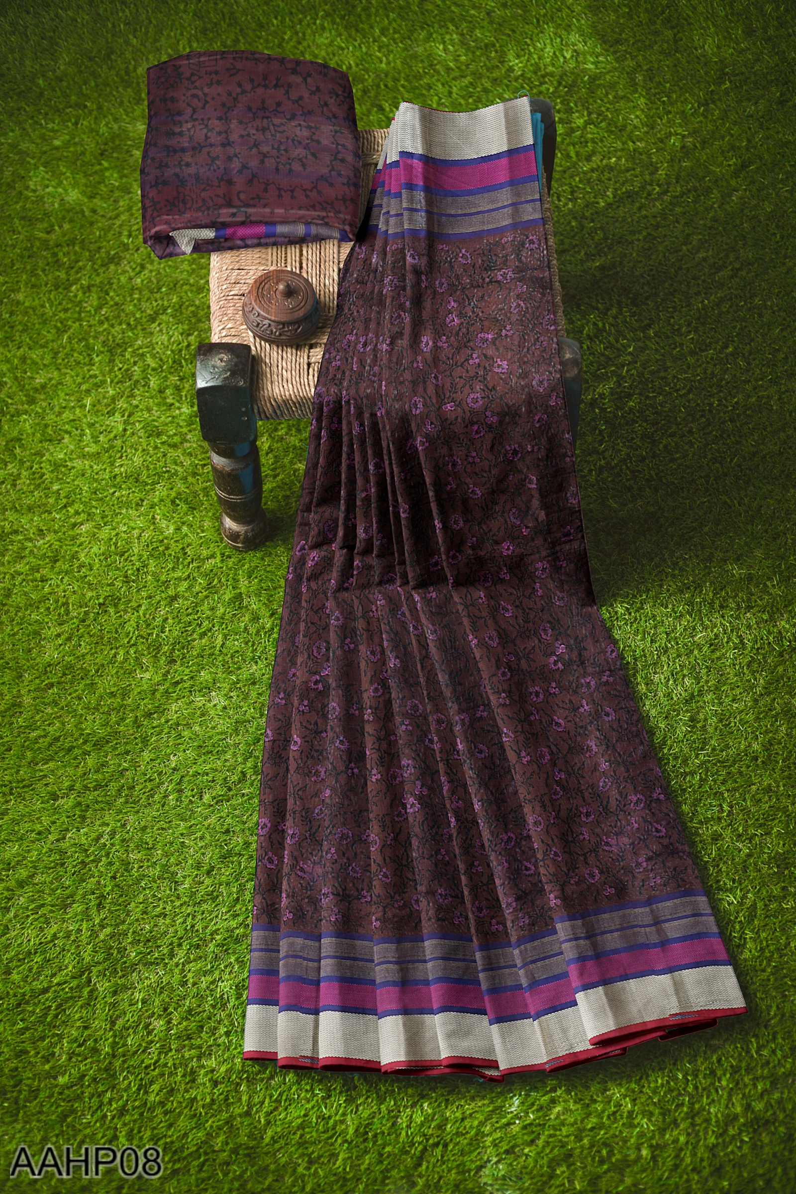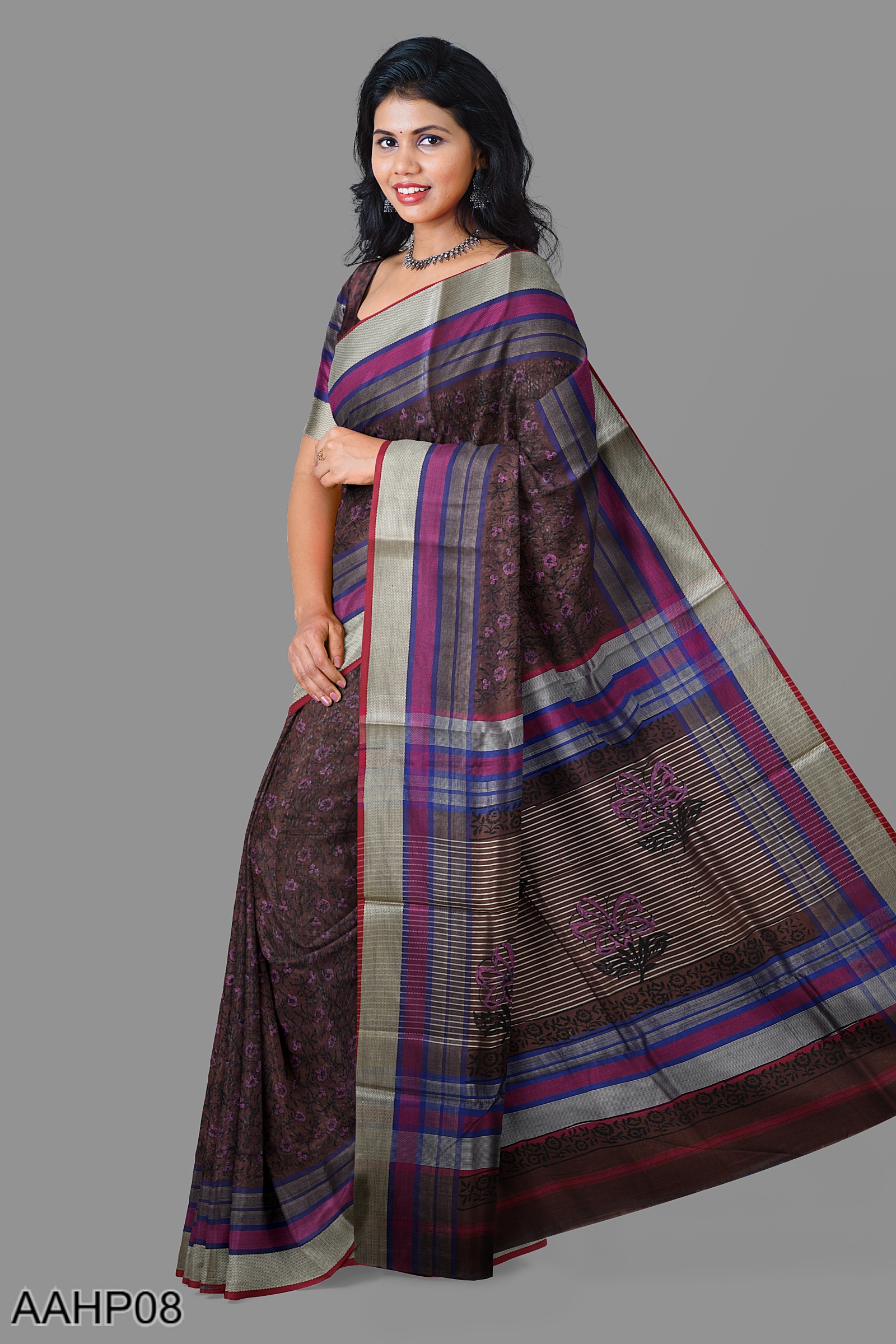 Deep purple handloom saree with an Ikat-inspired border and scattered block prints. The silk cotton weave allows movement while retaining form. An elegant pick for festive wear, cultural events, or everyday moments where quiet detail makes the difference.