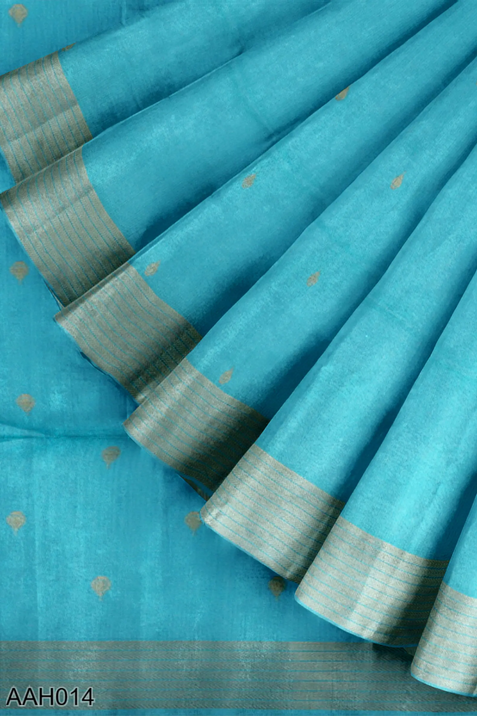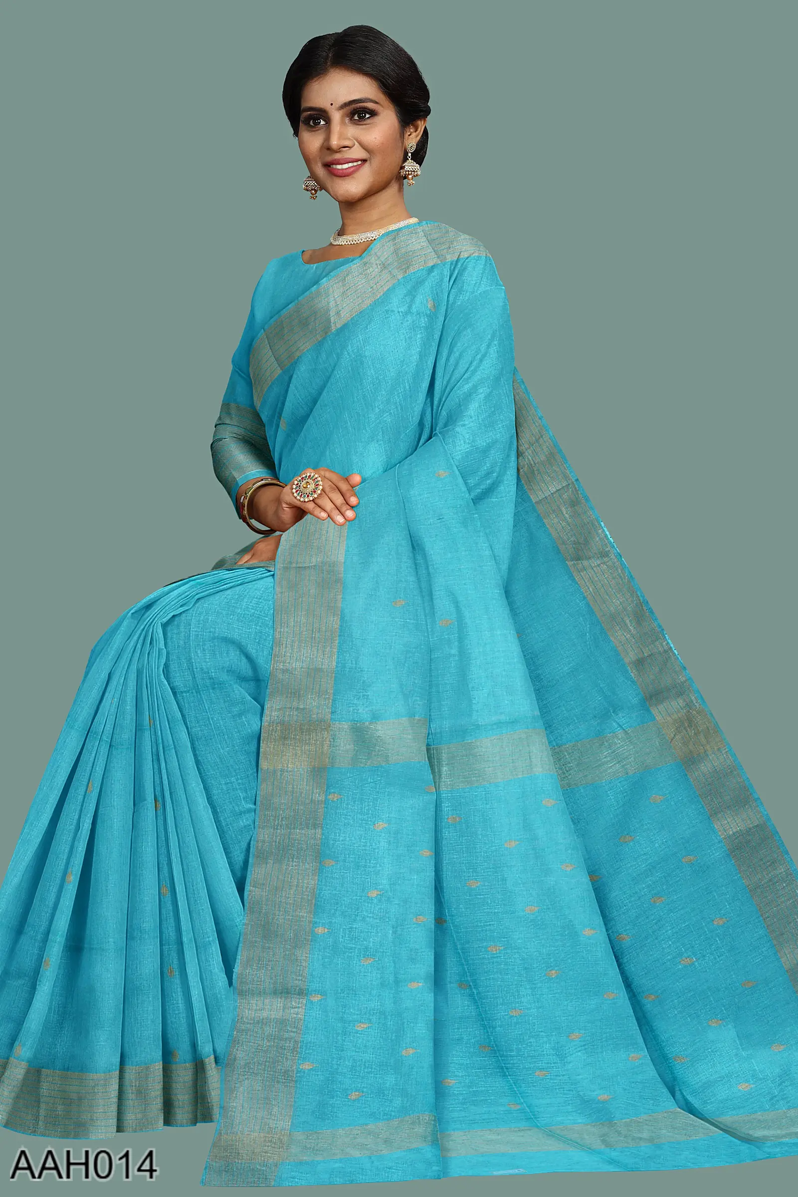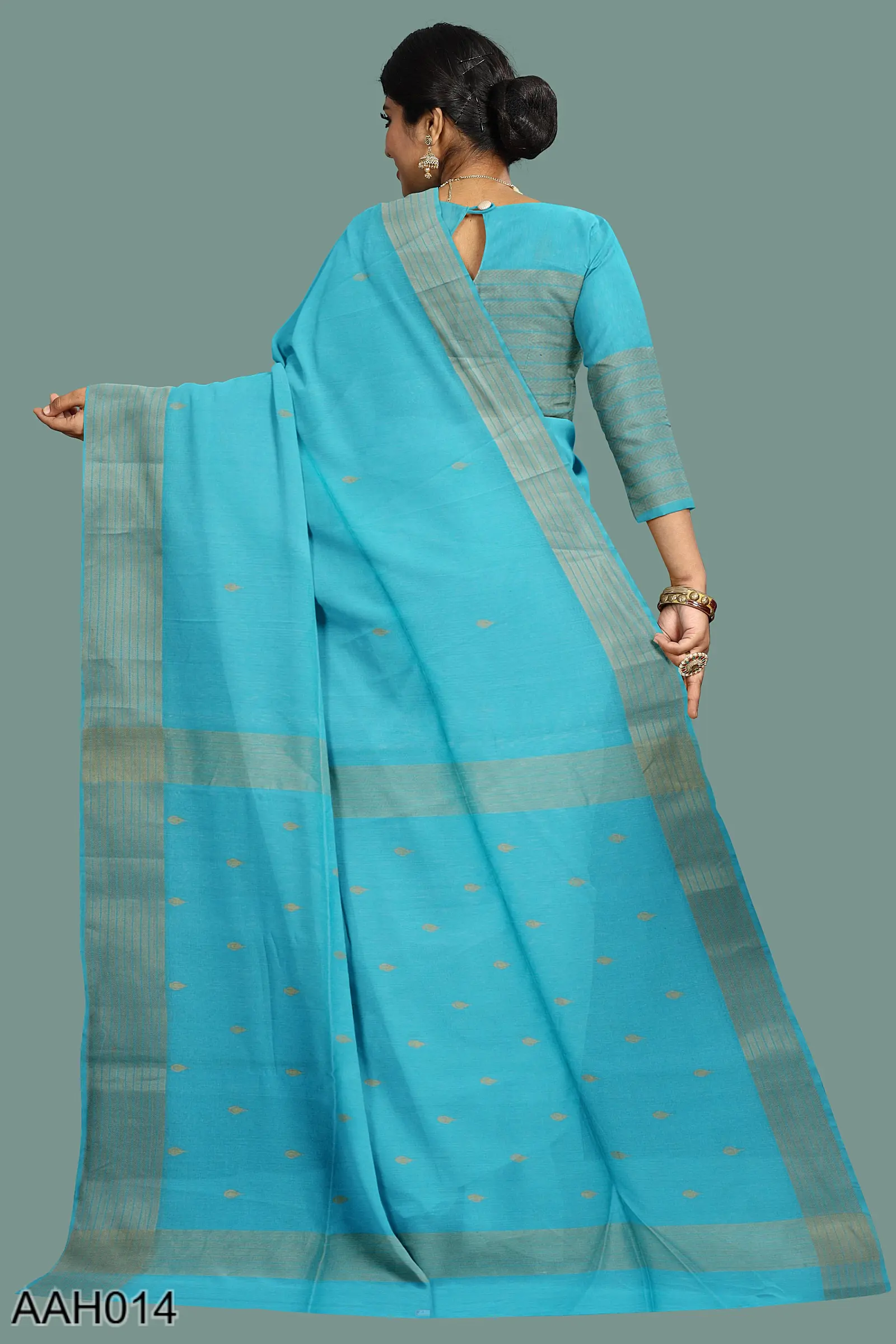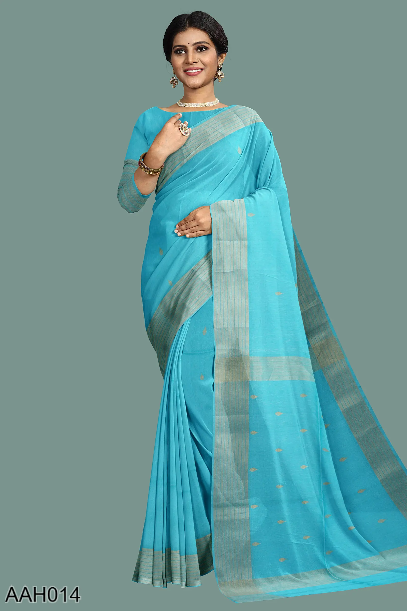 Sky blue saree in cotton silk with a running pallu and boond bootis across the body. Finished with a textured Stone V border that frames the drape gently. Light in weight, calm in feel — ideal for temple dressing or daytime tradition with polish.