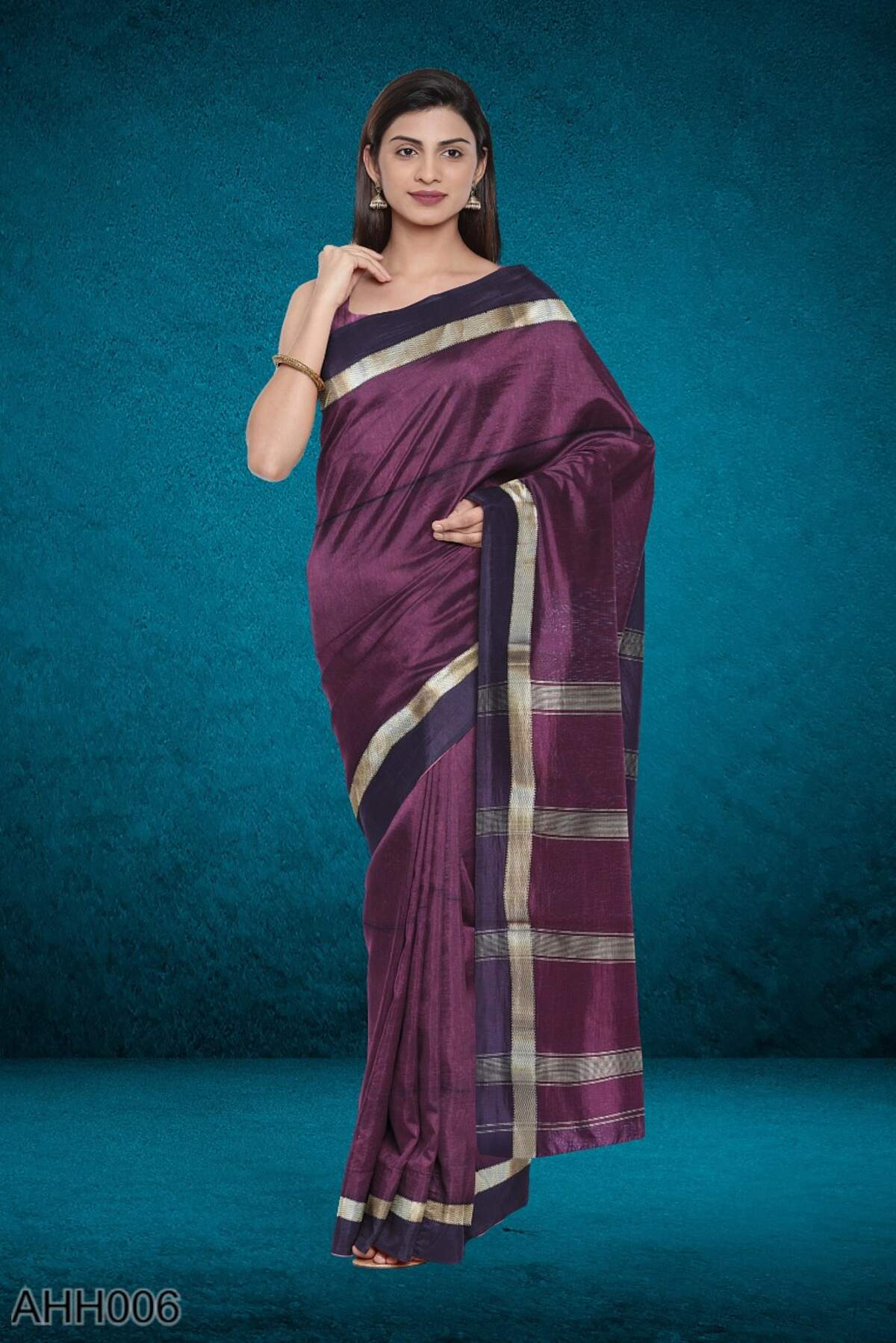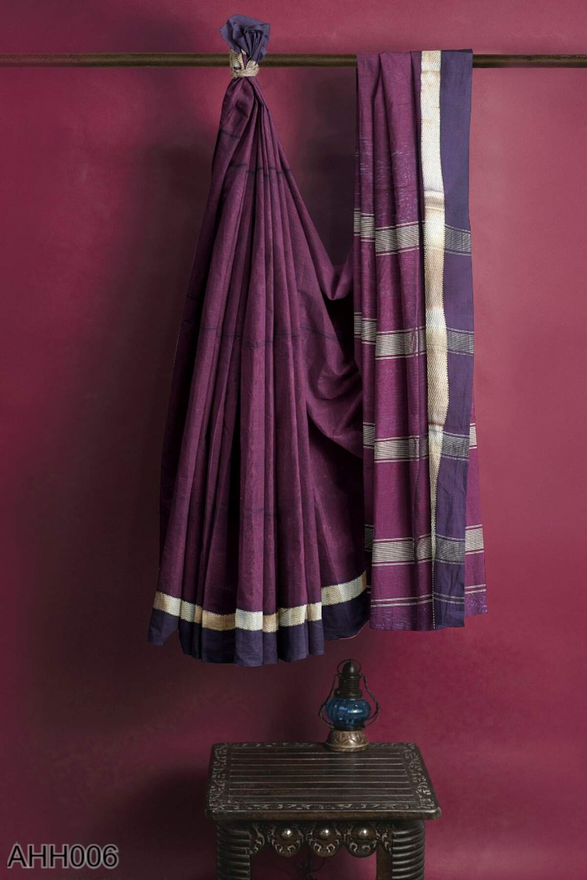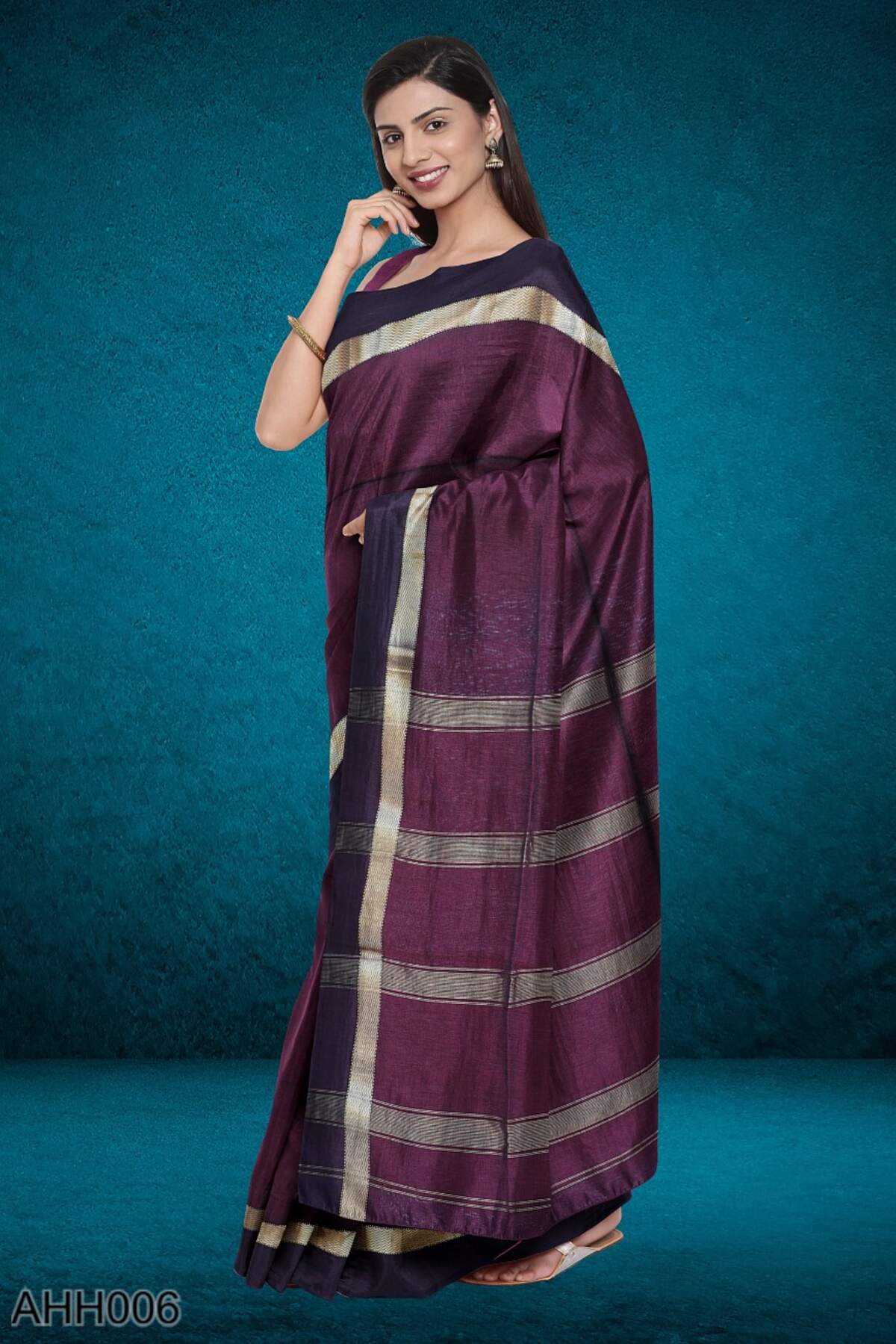 This coffee-toned cotton-silk saree carries zari stripes across the body and is framed with a classic Narmada Lehar border. The pallu adds flow without loudness. With a running blouse, it’s a versatile choice for everyday rituals, office pujas, or low-key festive moments.