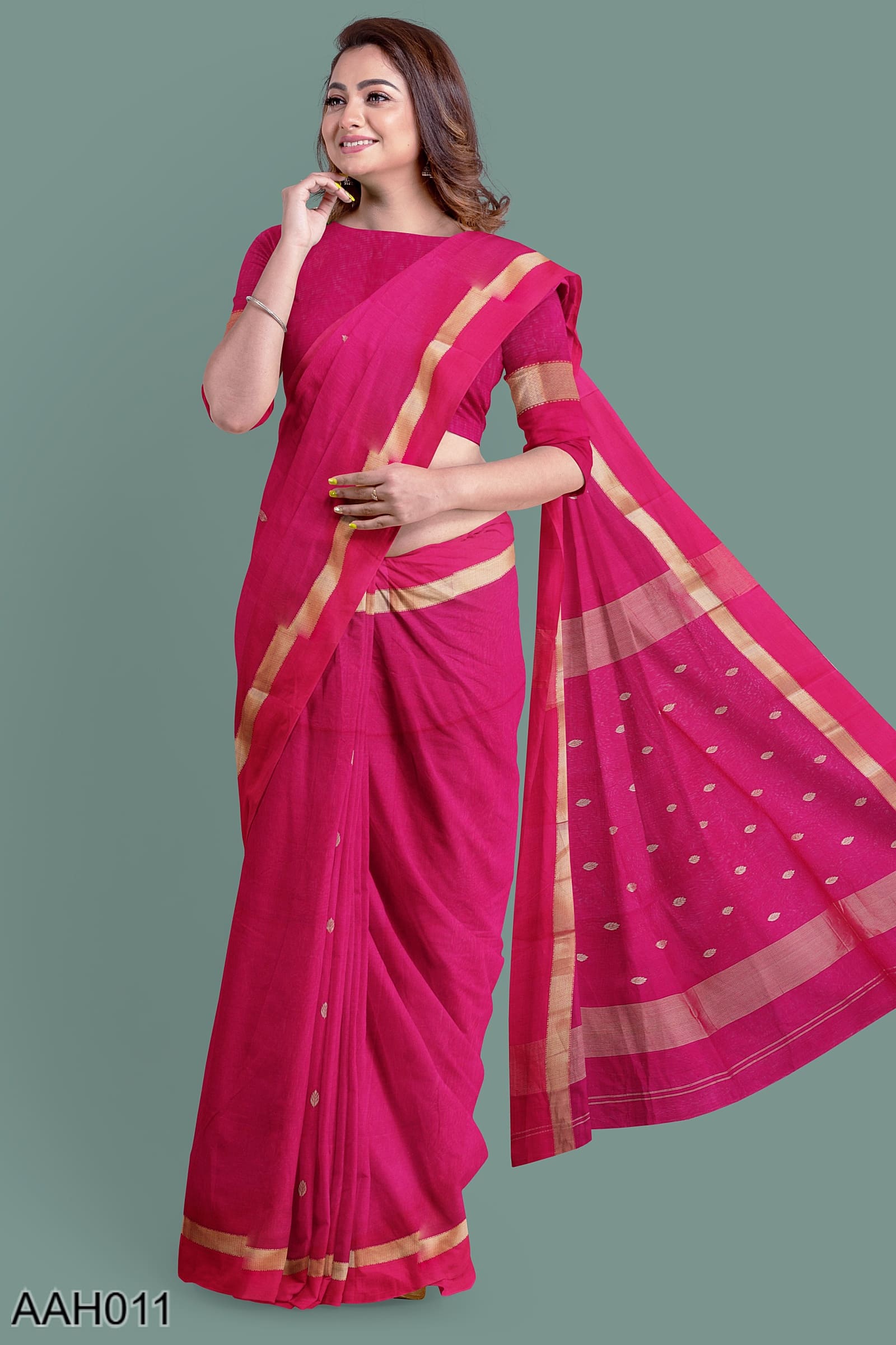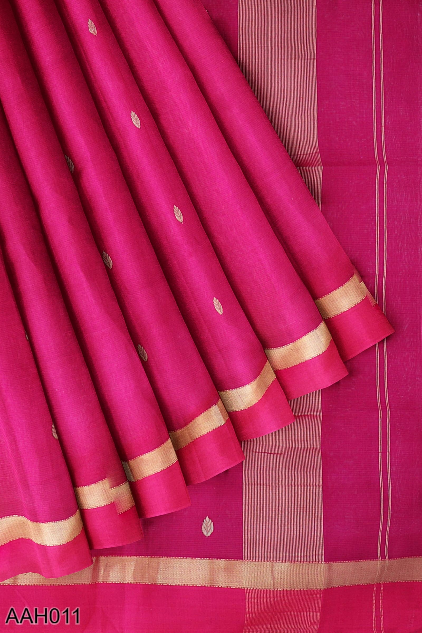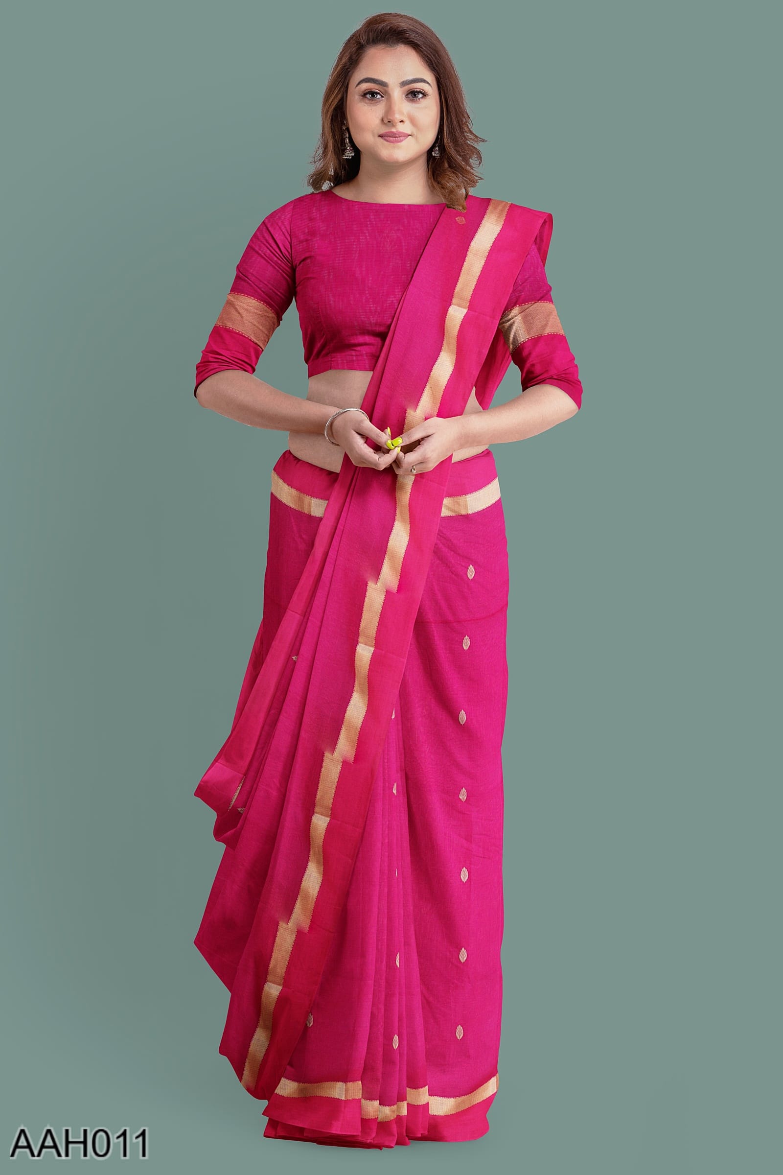 French pink cotton silk saree with a running pallu and patti booti detail. The body features mercerised cotton butis, finished with a Narmada Lehar border. Soft, breathable, and easy to wear — ideal for poojas, light festive dressing, or gifting something elegant and quietly traditional.