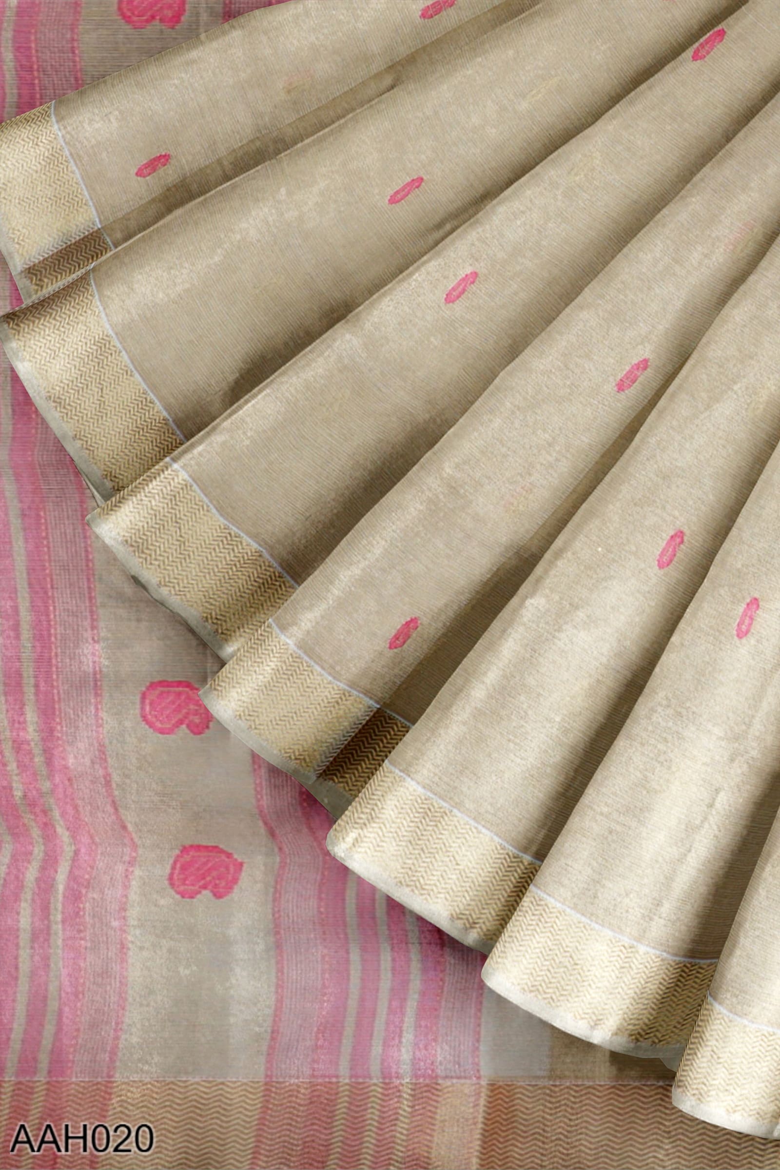 Cream silk-cotton saree with a tissue finish and all-over keri bootis. The pallu repeats the motif, framed by a golden-silver Rehwa Lehar border. Feels festive without excess. A lovely choice for weddings, reception mornings, or soft formal dressing with depth.