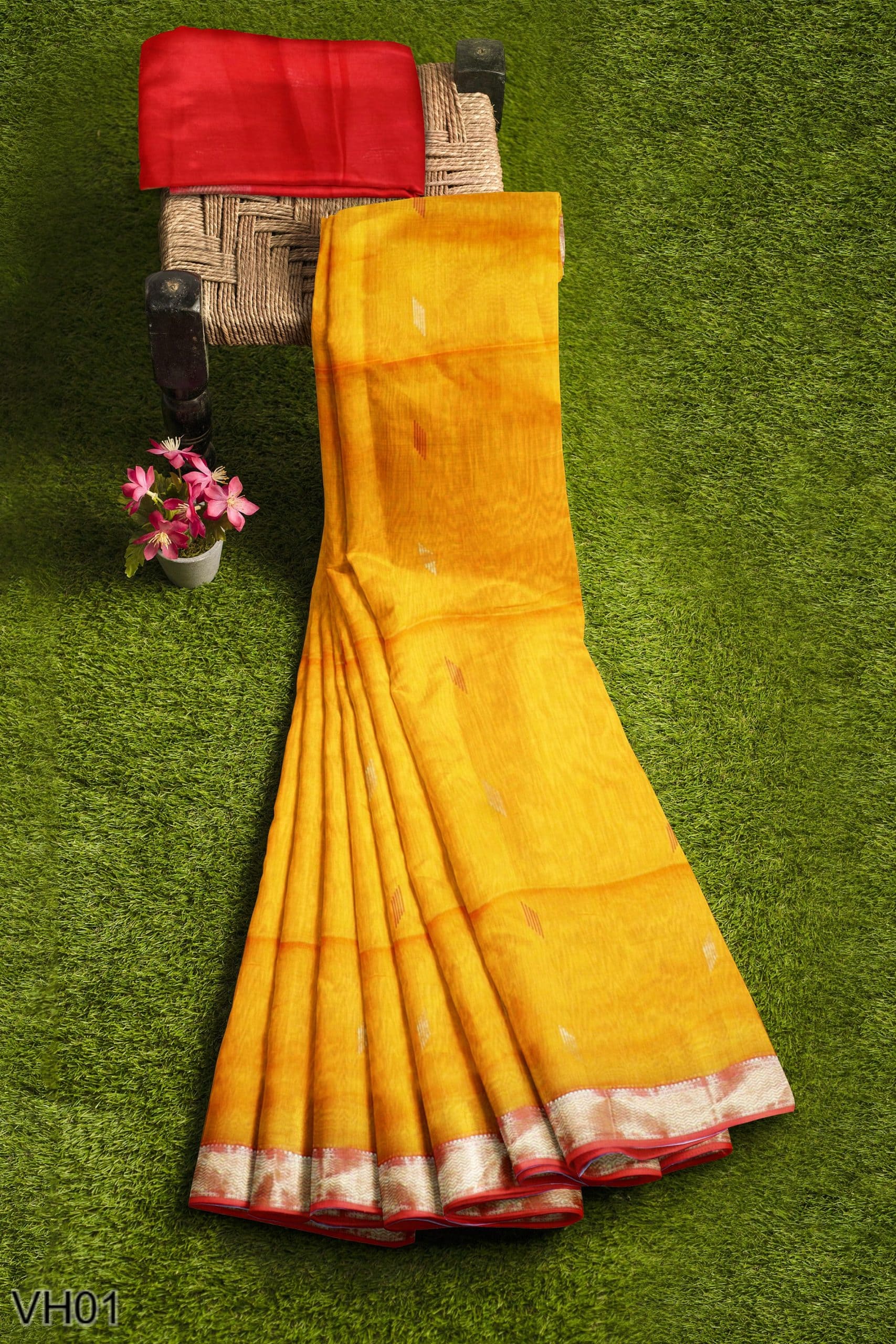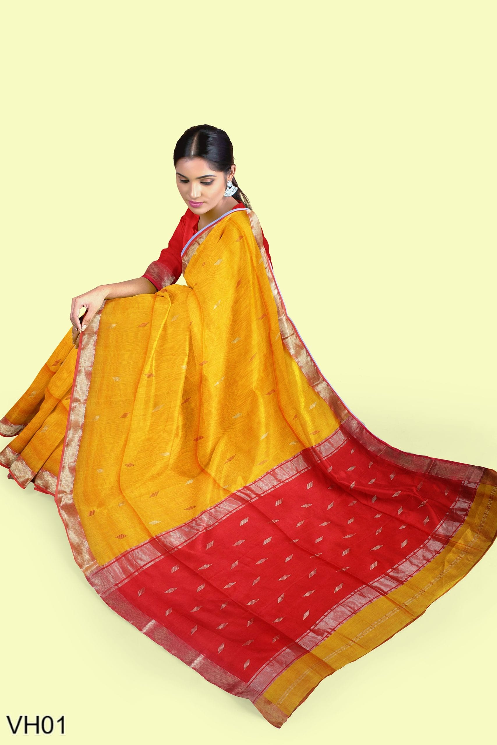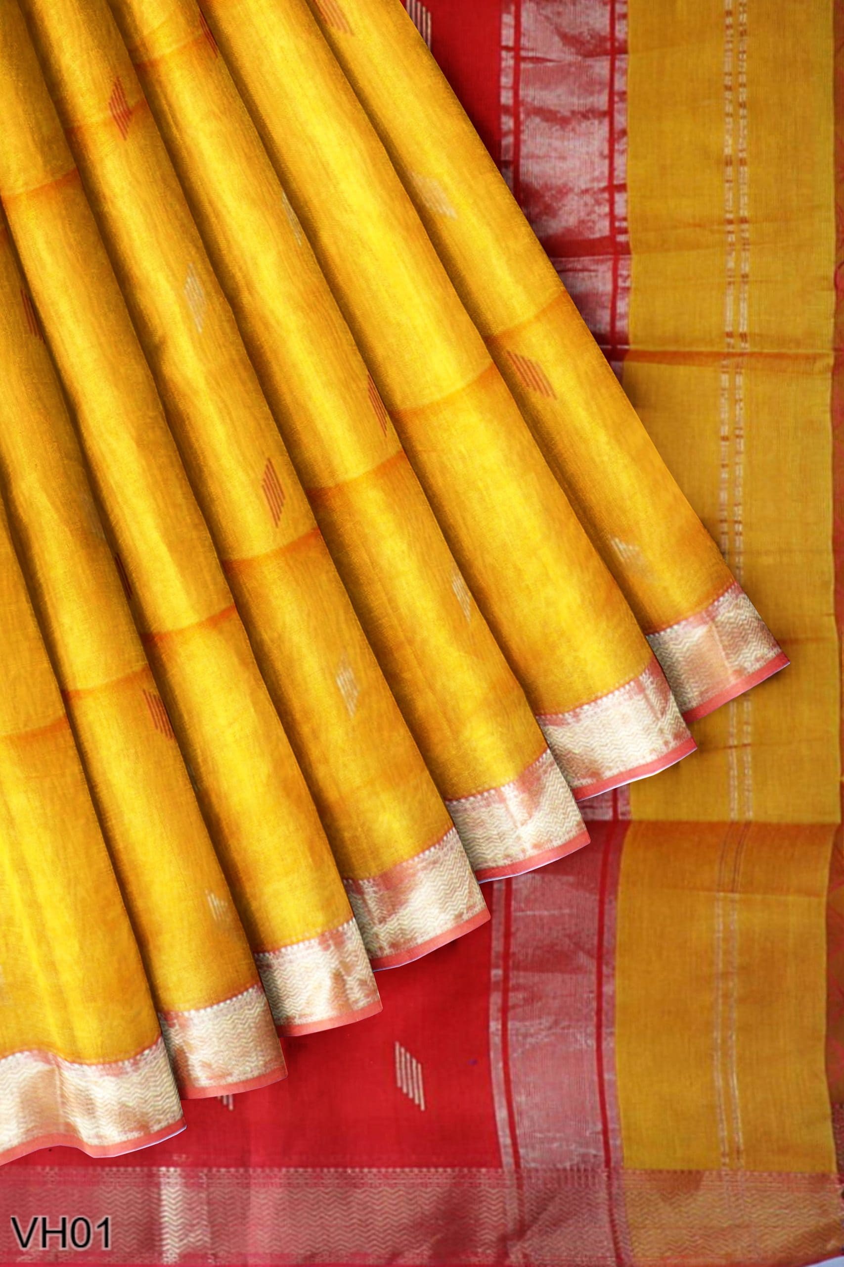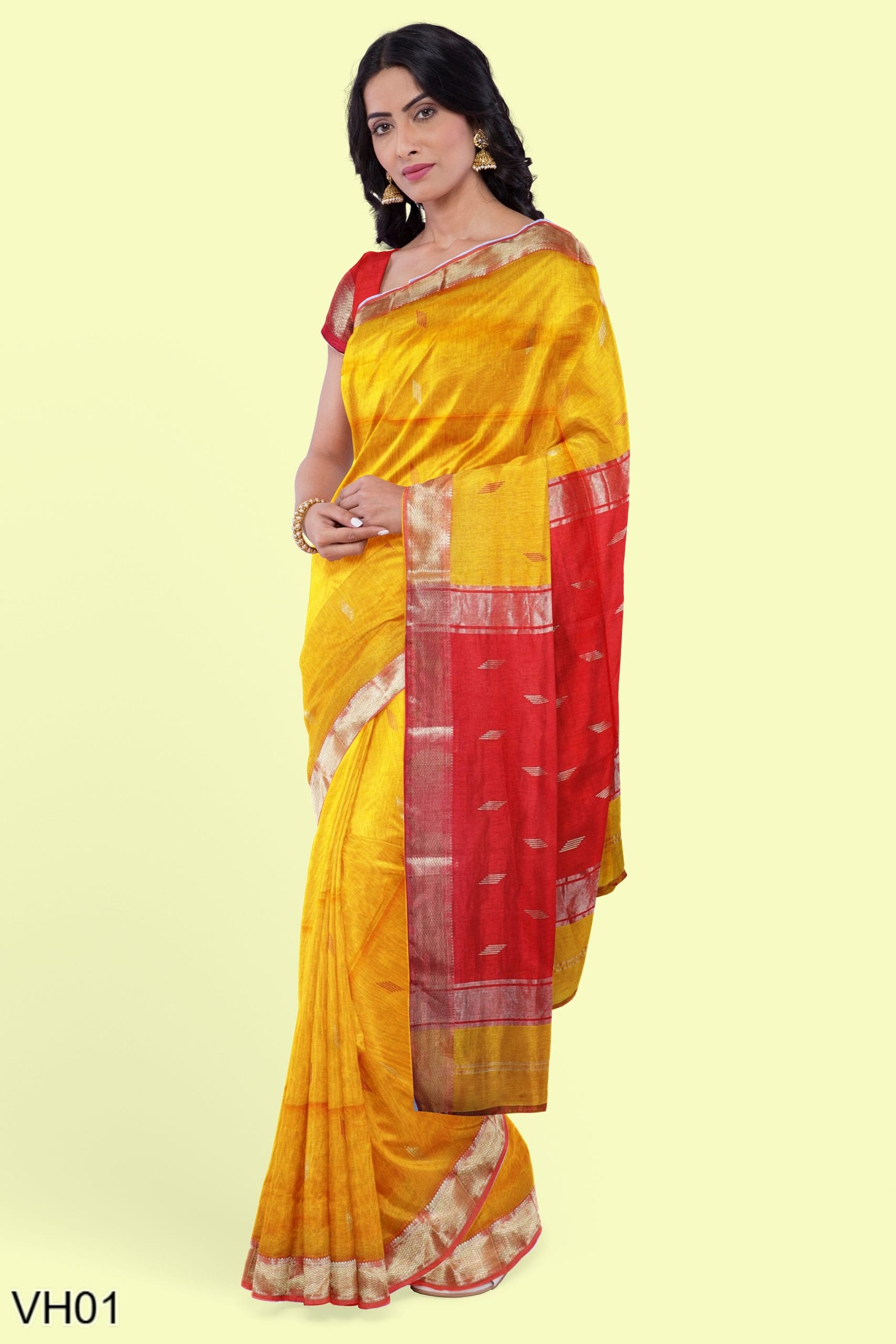 A radiant mustard yellow cotton-silk saree woven with a classic golden zari border and deep red pallu. The saree carries light golden butis across the body and comes with a contrast blouse. Ideal for haldi, festive pujas, or gifting traditions that never fade.