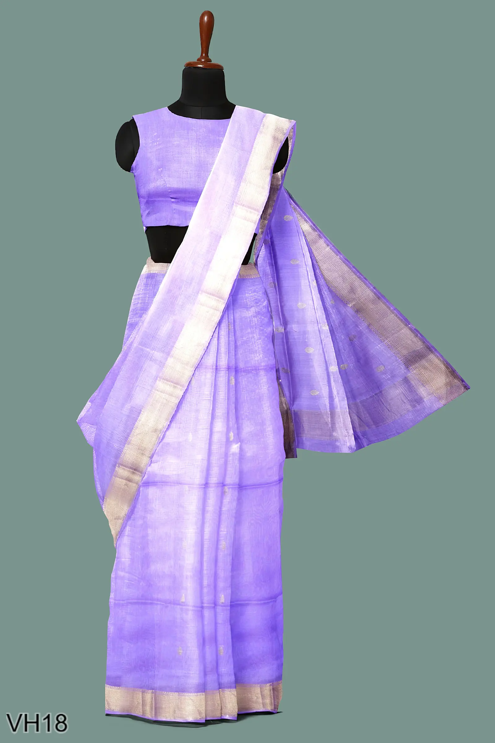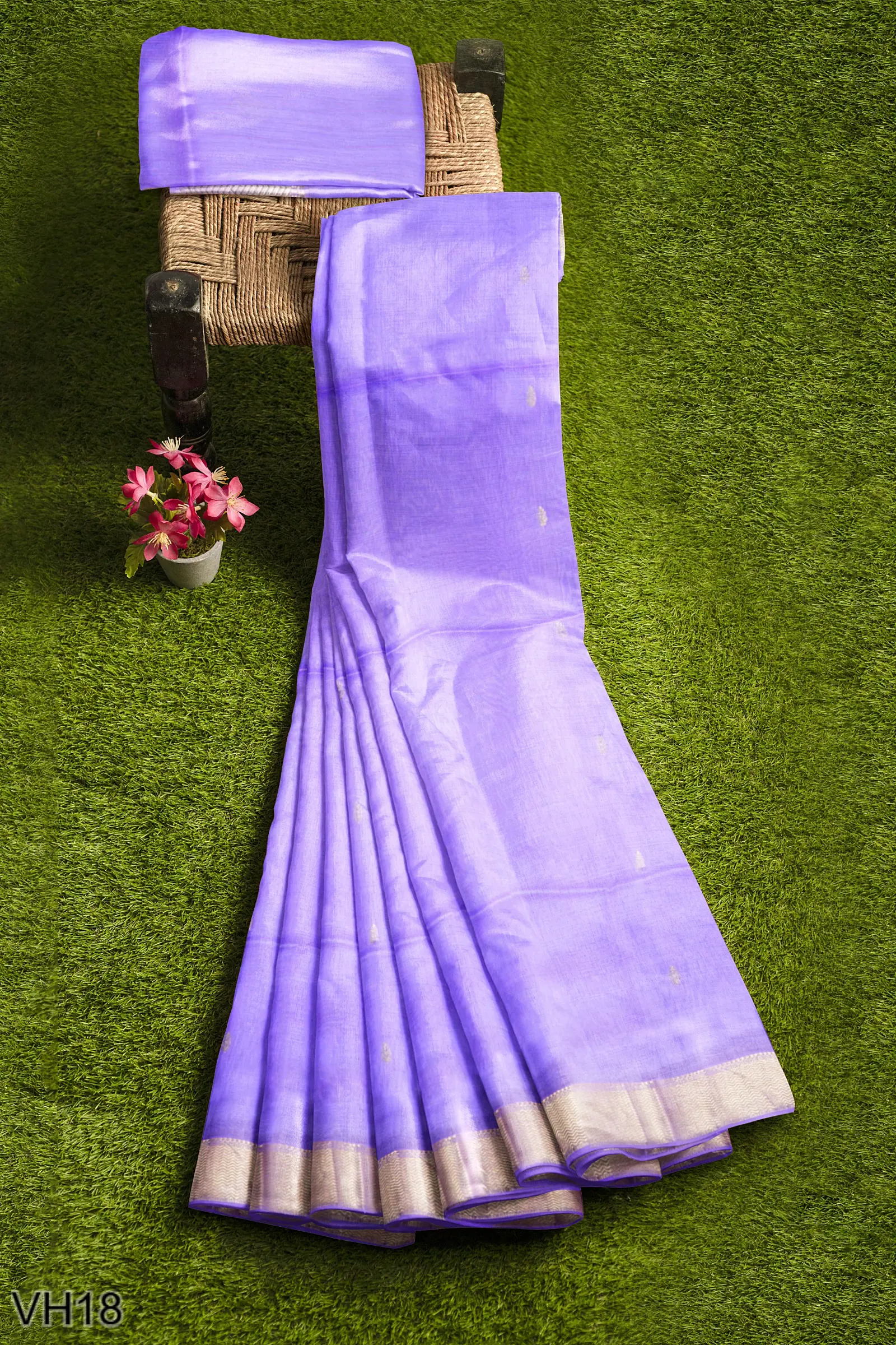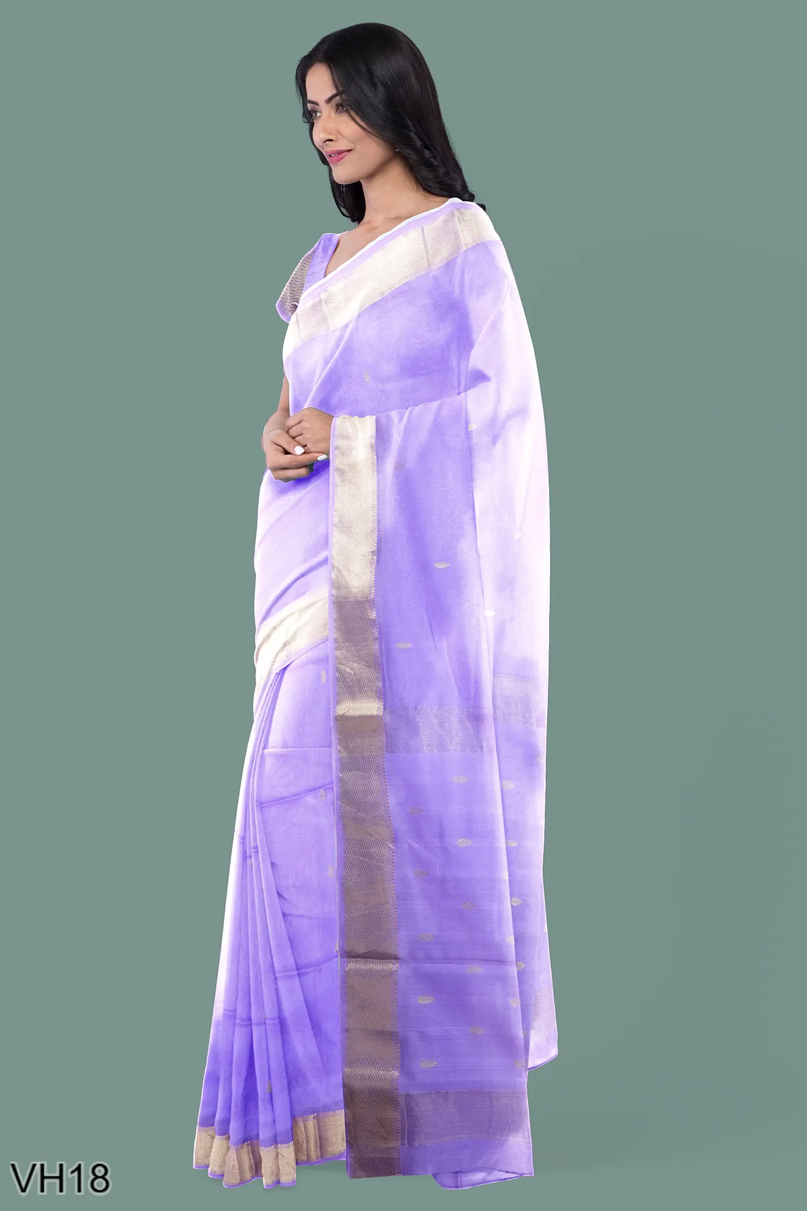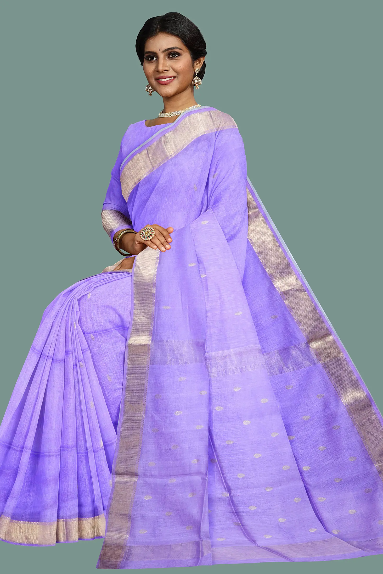 This lavender saree features neem patti bootis and a Narmada Lehar border. The body is soft, and the blouse comes in plain contrast. A peaceful, breathable choice for spiritual dressing or elevated everyday wear.