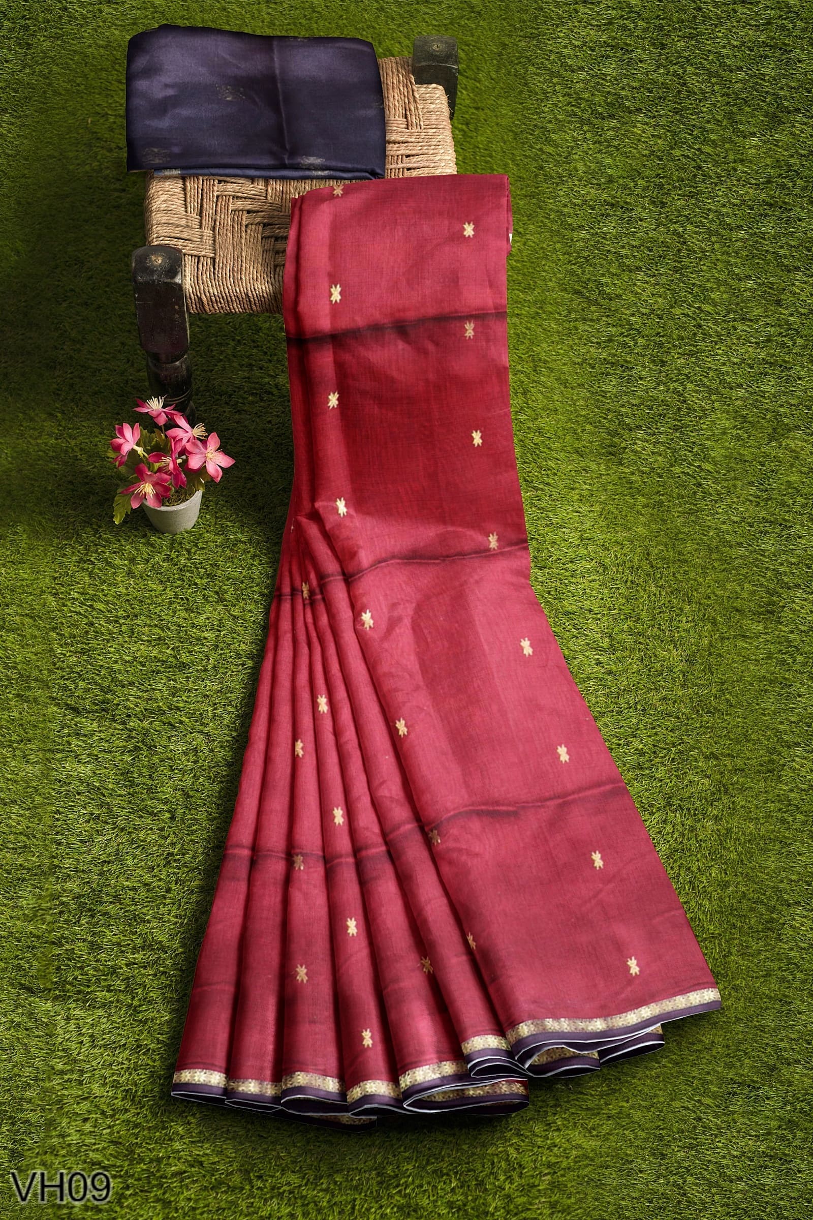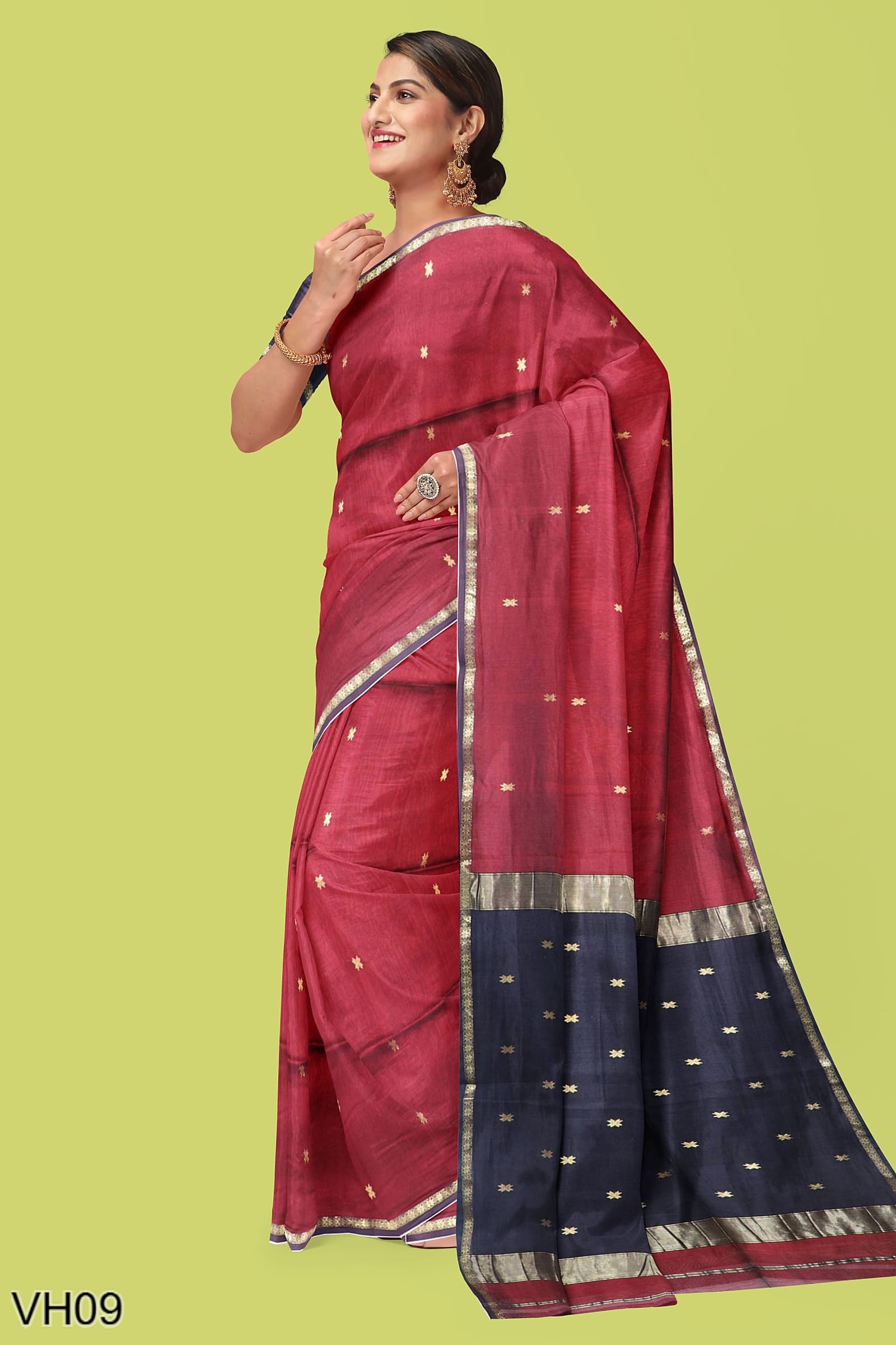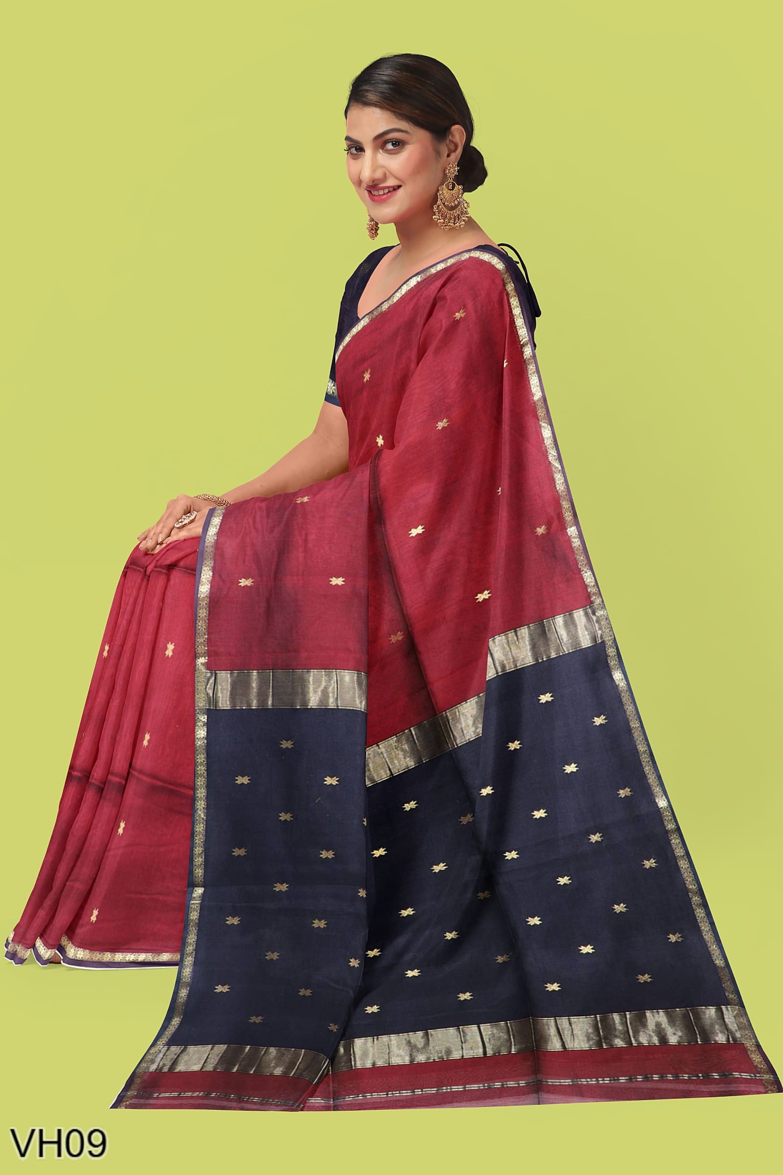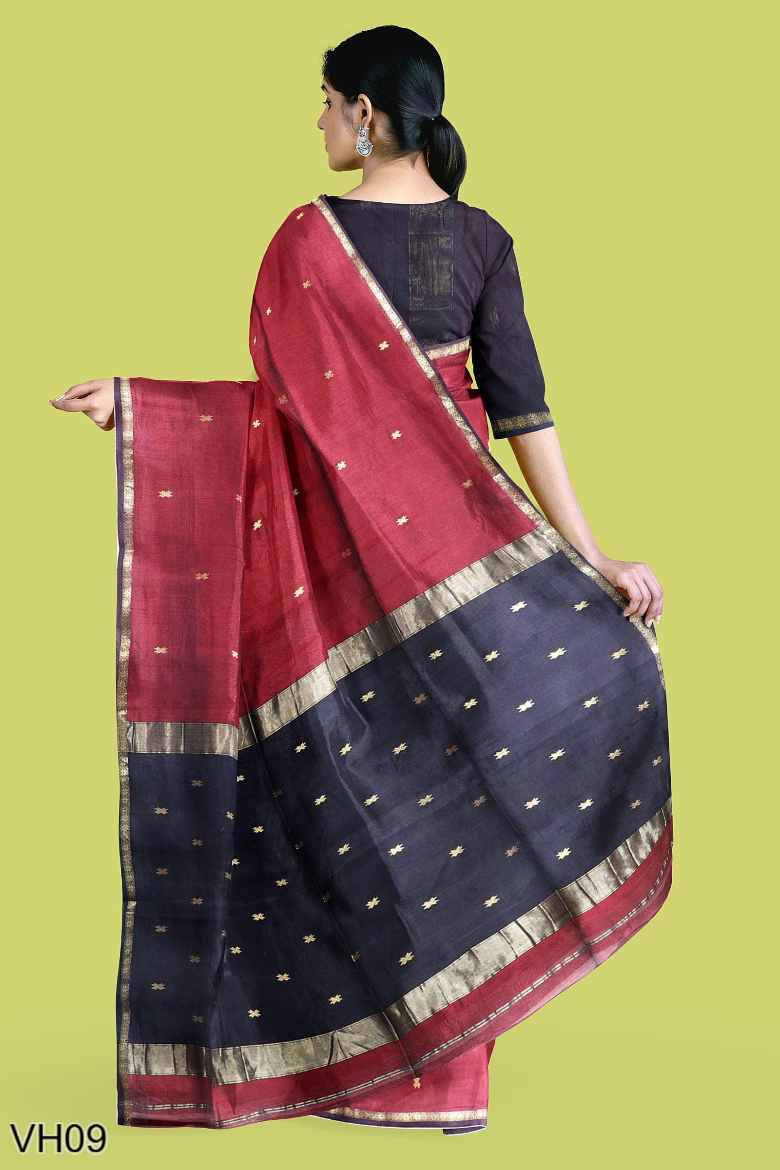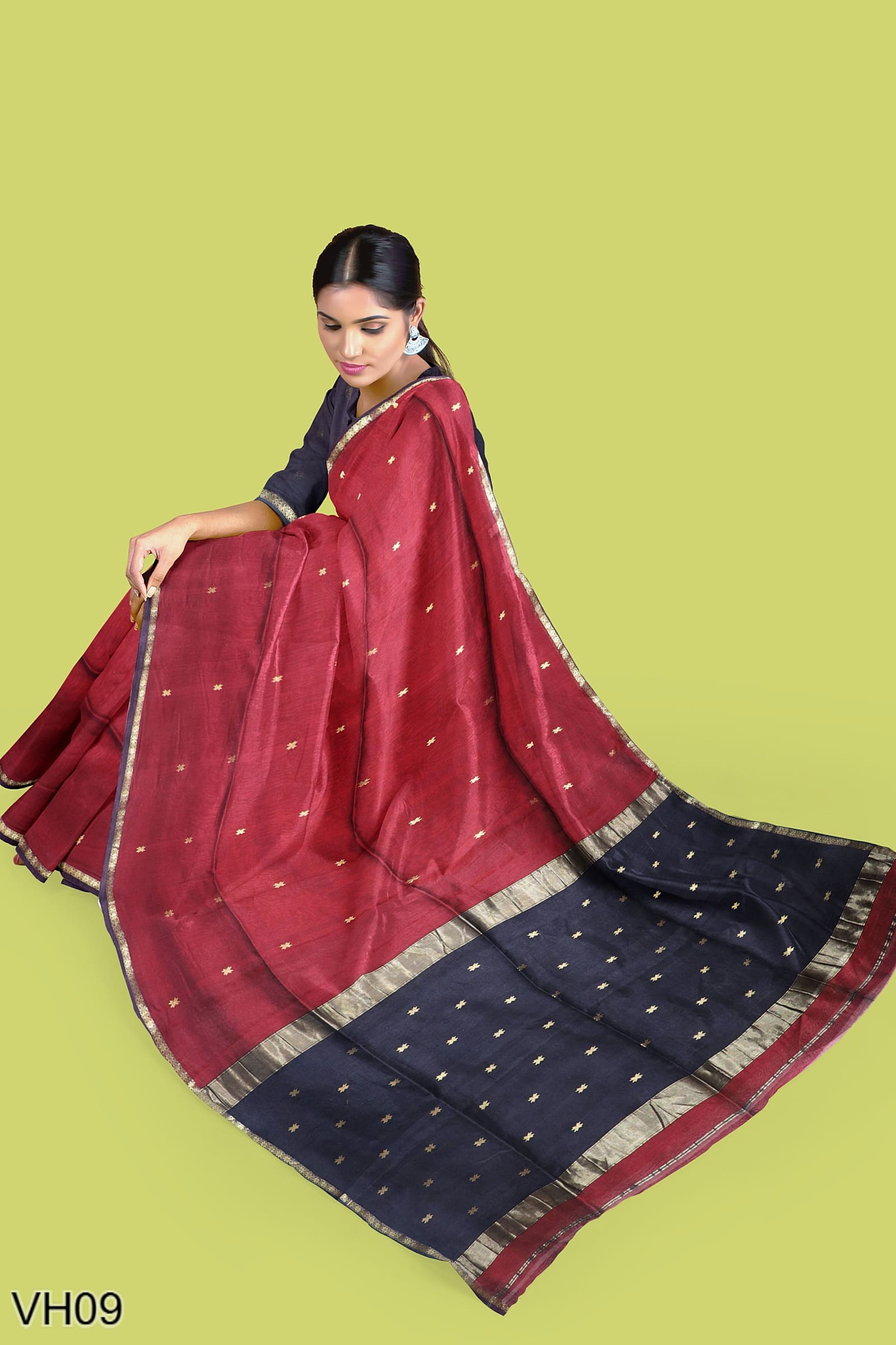 A deep maroon saree in cotton-silk with a black pallu featuring Chameli Phool bootis. The saree balances tone with craft and comes with a black blouse. Ideal for weddings, religious gatherings, or standout festive wear.