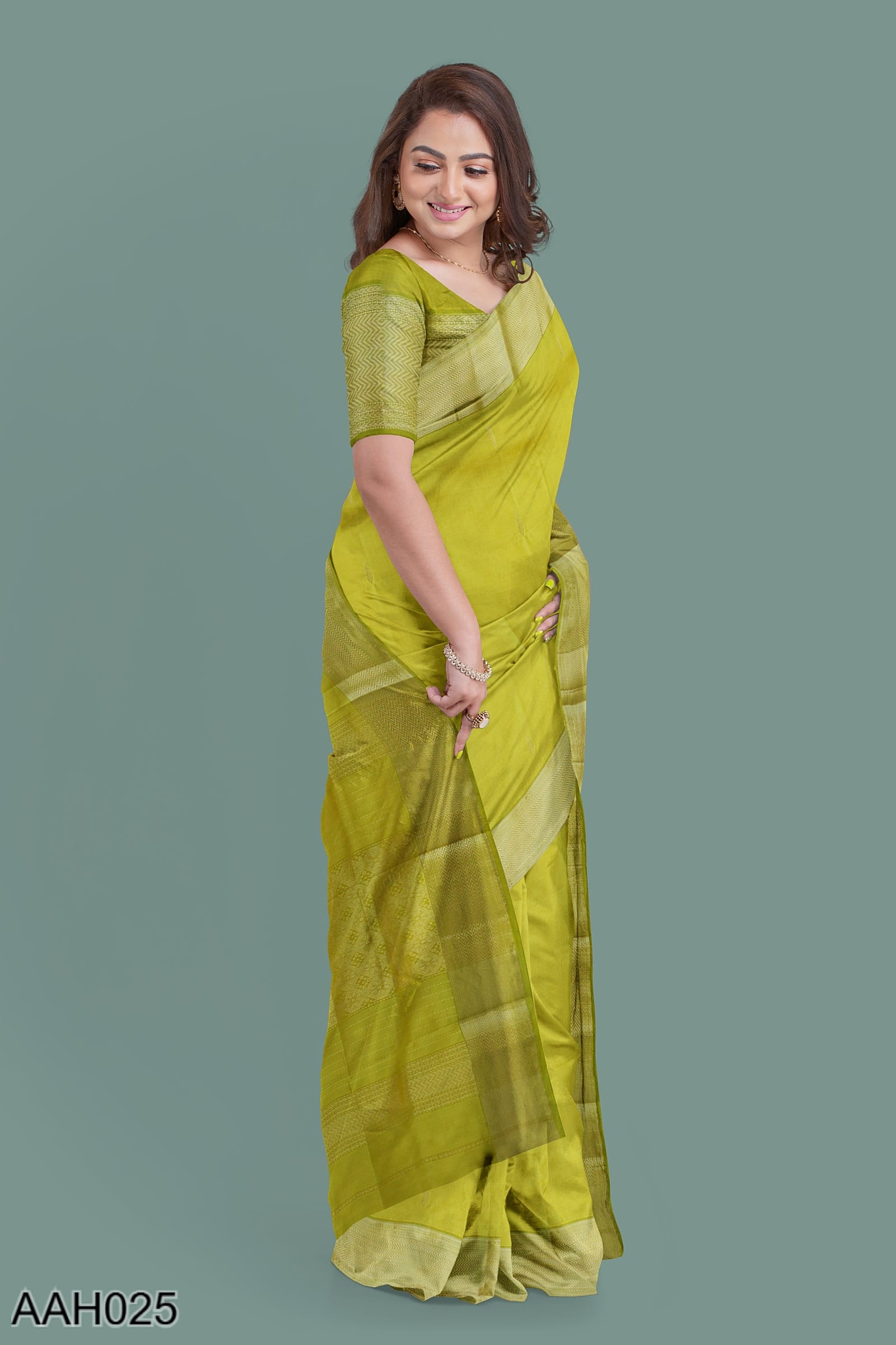 Lemon yellow silk saree with layered tones of green — from bottle to forest — in the border and pallu. The Rewa Lehar pattern gives it a festive finish. Drapes smooth with a gentle shine. A fresh pick for gifting, summer functions, or joyful dressing.