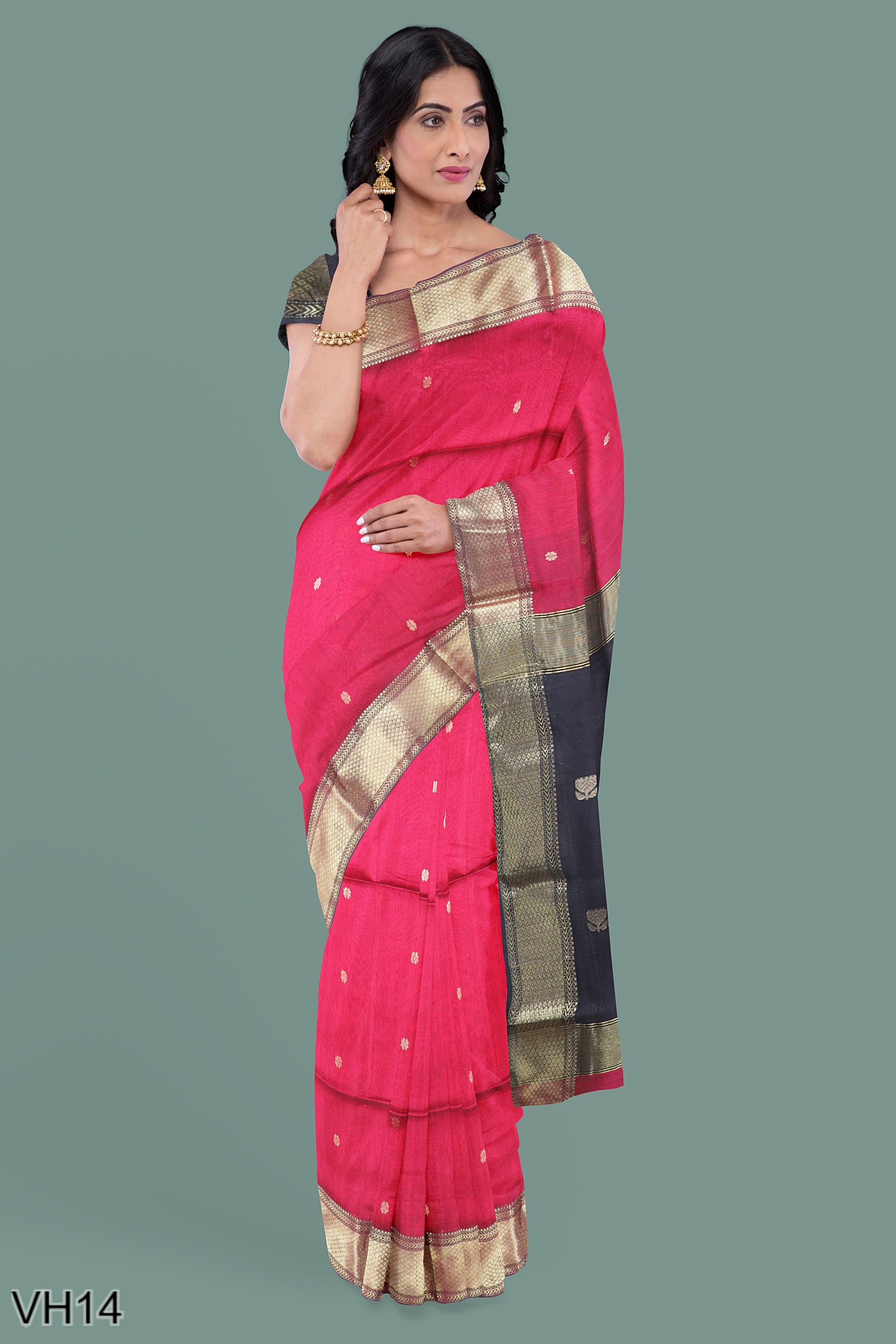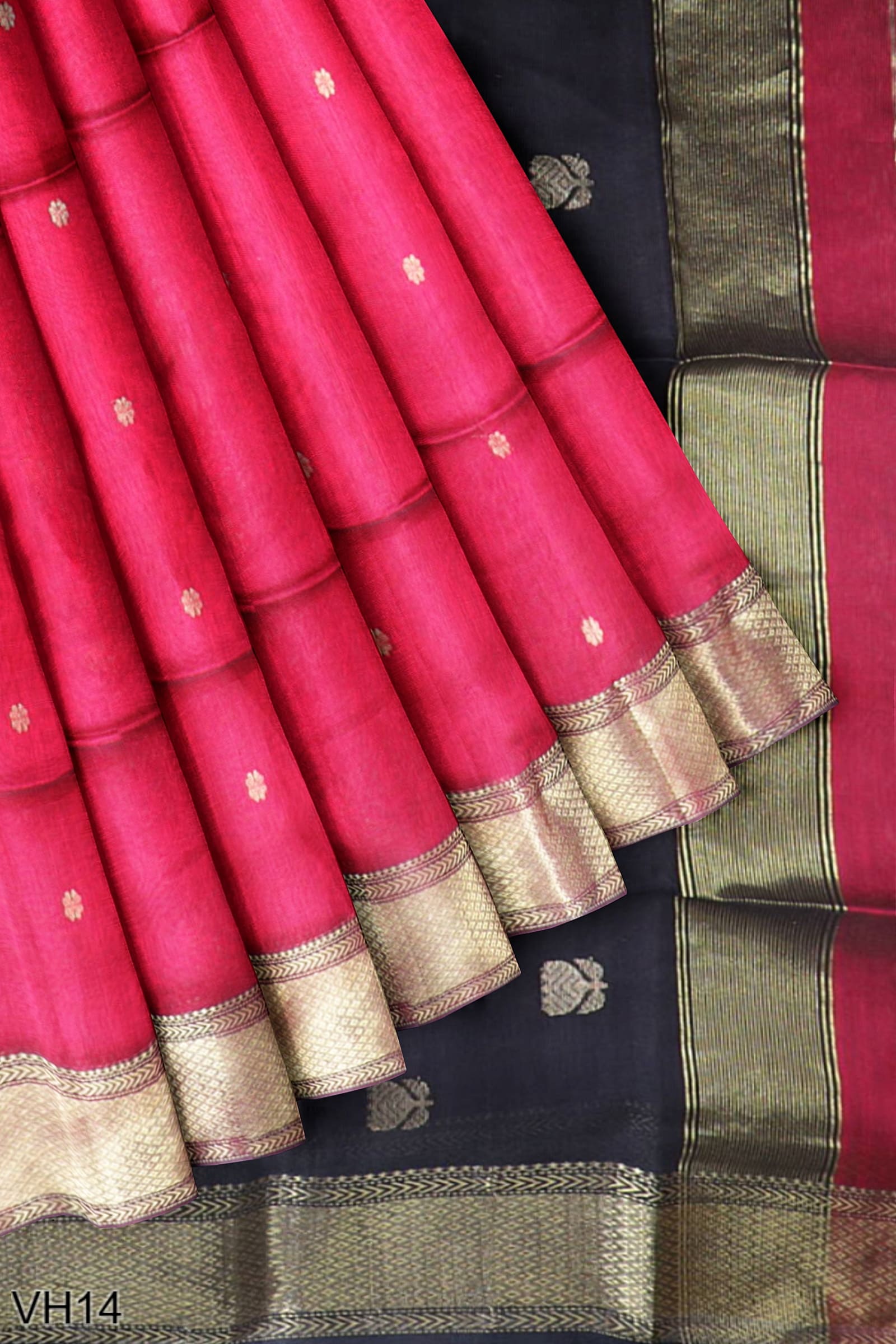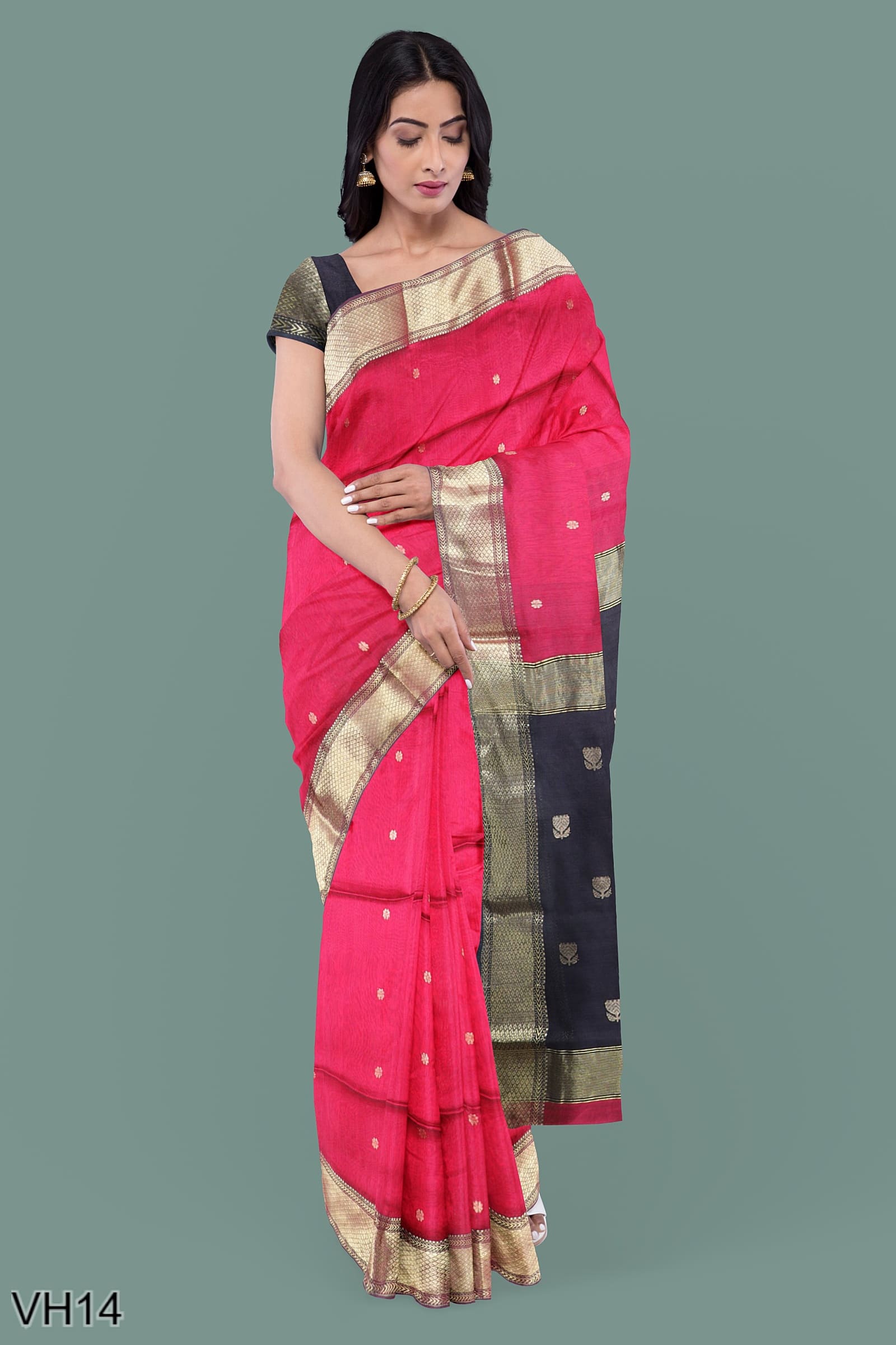 A striking punch red saree with a black pallu, finished with lotus motifs and a bold diamond border. This cotton-silk drape adds festive flair without being overpowering — perfect for gifting or statement celebrations.