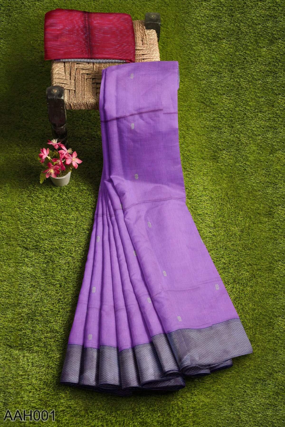 A lavender cotton-silk saree with a Rui Phool booti skirt border and a soft zari pallu. The diamond border adds quiet definition, while the contrast blouse brings a touch of colour play. Light, graceful, and perfect for heritage gifting or festive mornings.