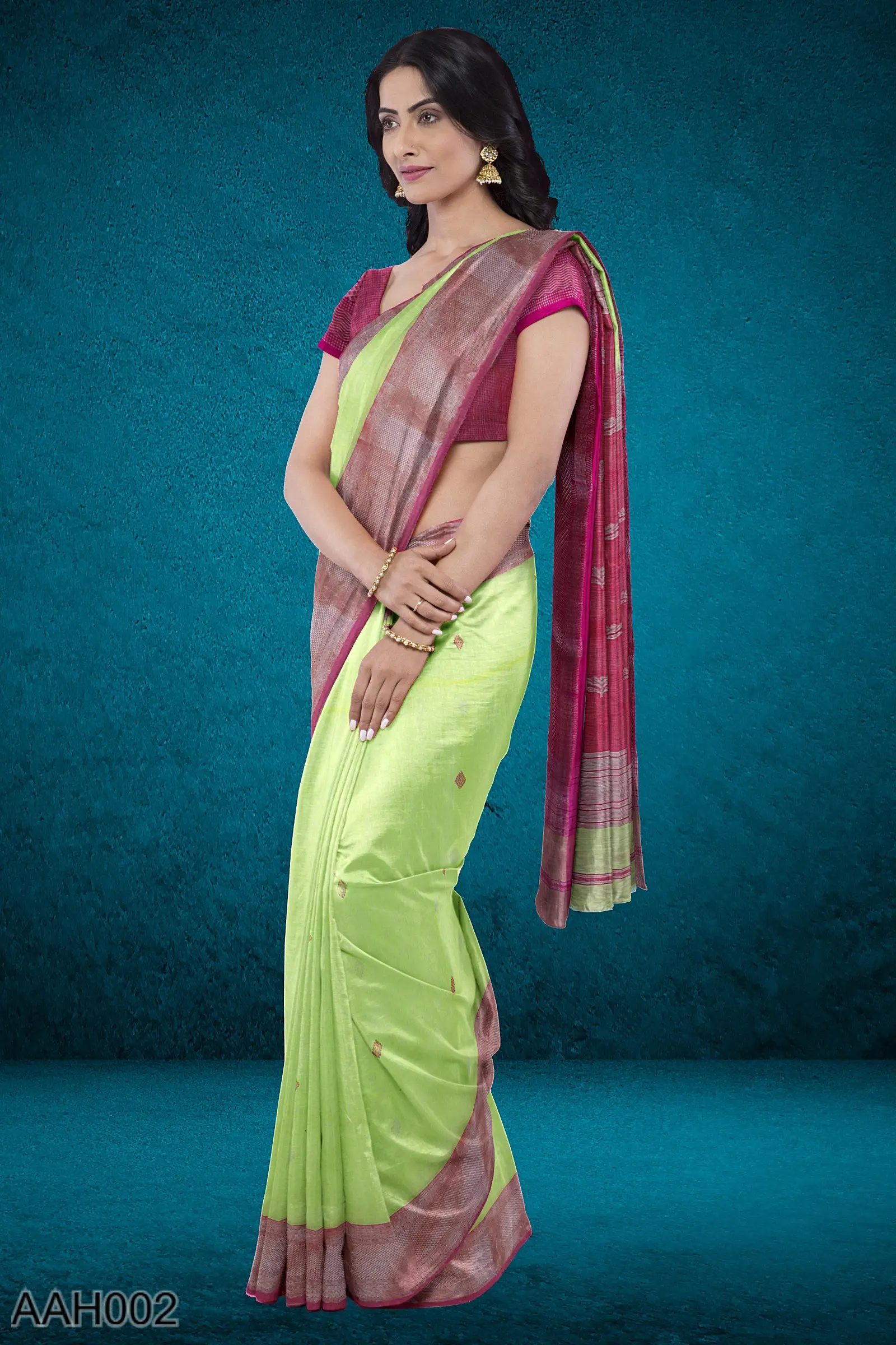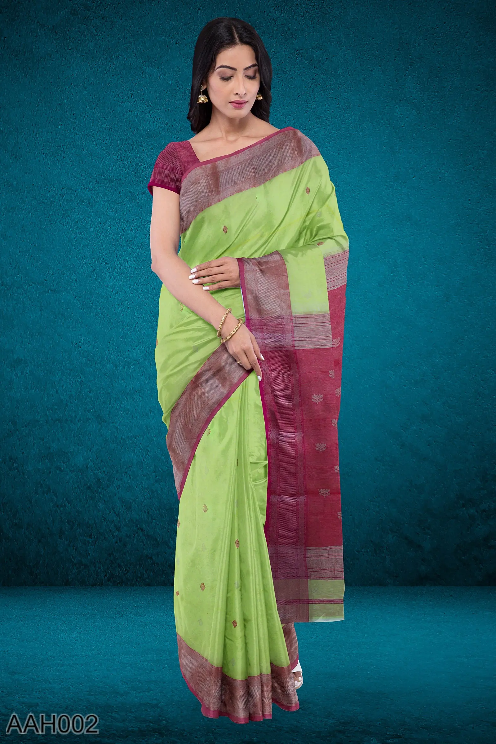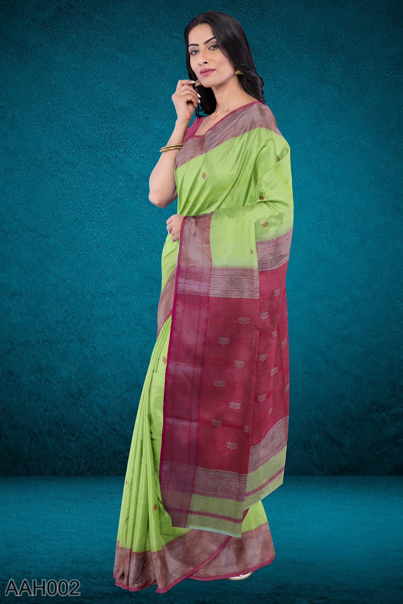 This pista green tissue saree features delicate lotus bootis across the body and a lustrous zari pallu. The karwat Narmada Lehar border gives it a subtle wave-like finish. With a contrast blouse, it’s a fresh pick for poojas, temple occasions, or summer celebrations.