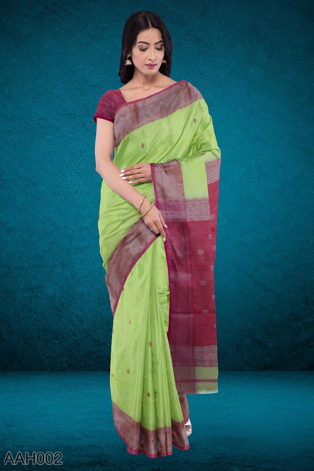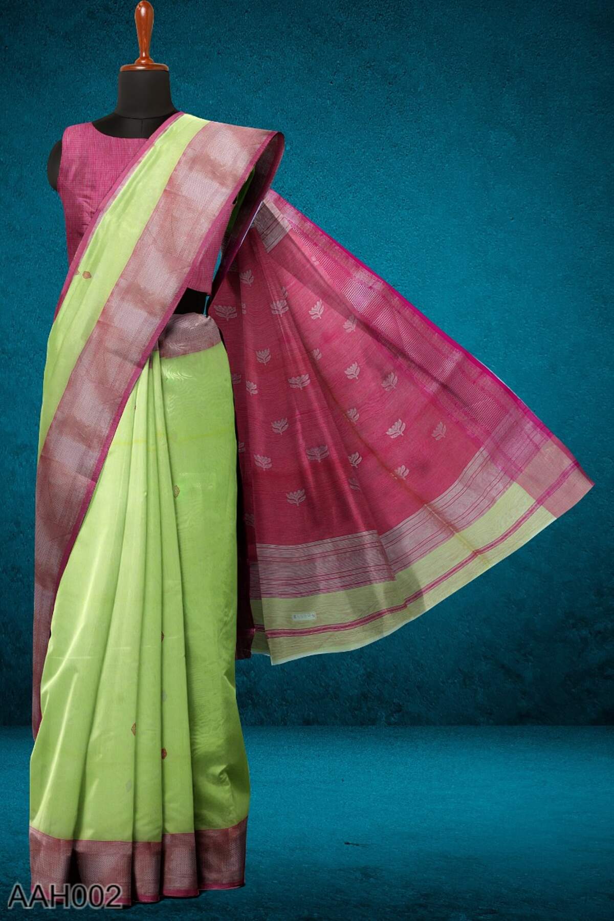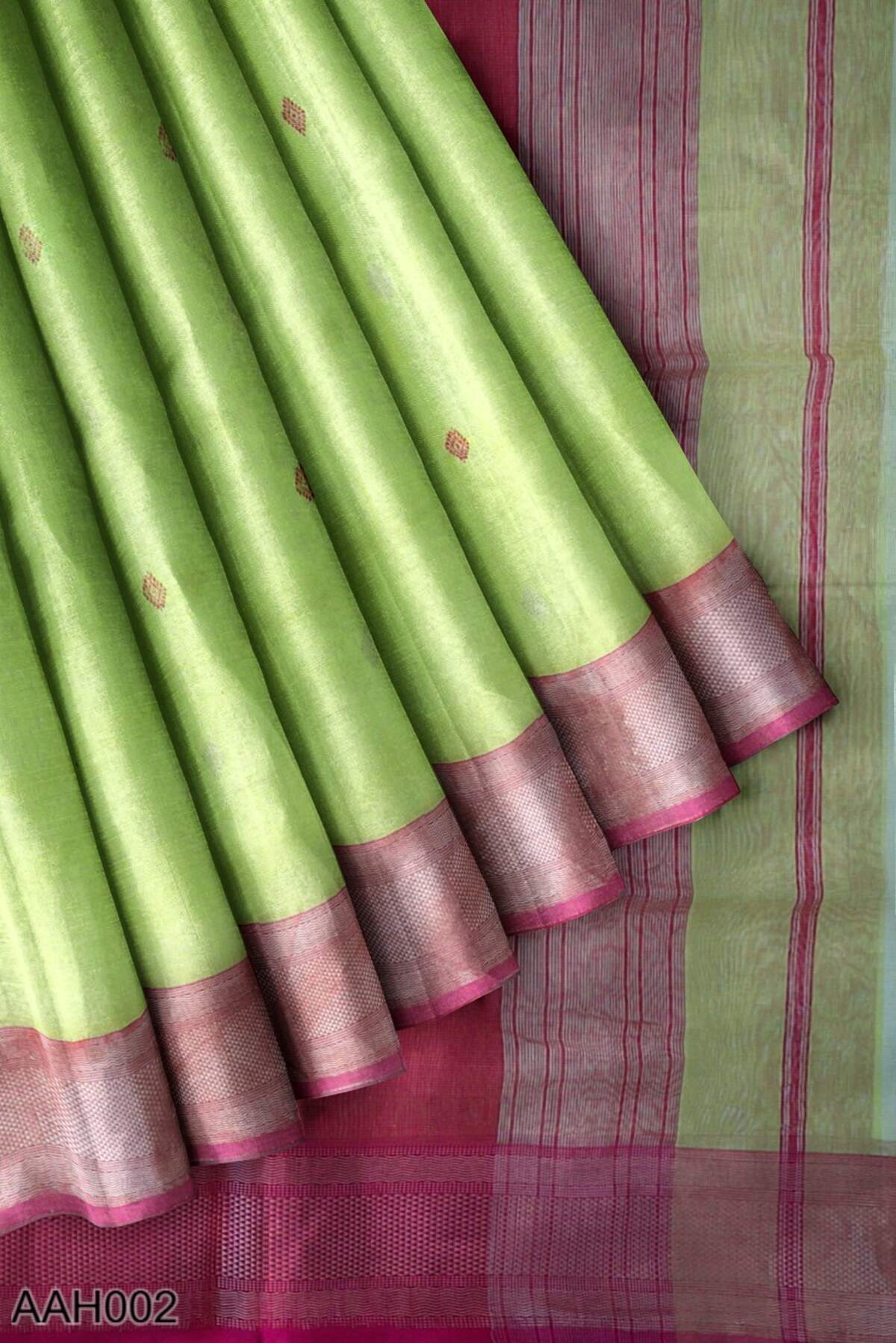 This pista green tissue saree features delicate lotus bootis across the body and a lustrous zari pallu. The karwat Narmada Lehar border gives it a subtle wave-like finish. With a contrast blouse, it’s a fresh pick for poojas, temple occasions, or summer celebrations.
