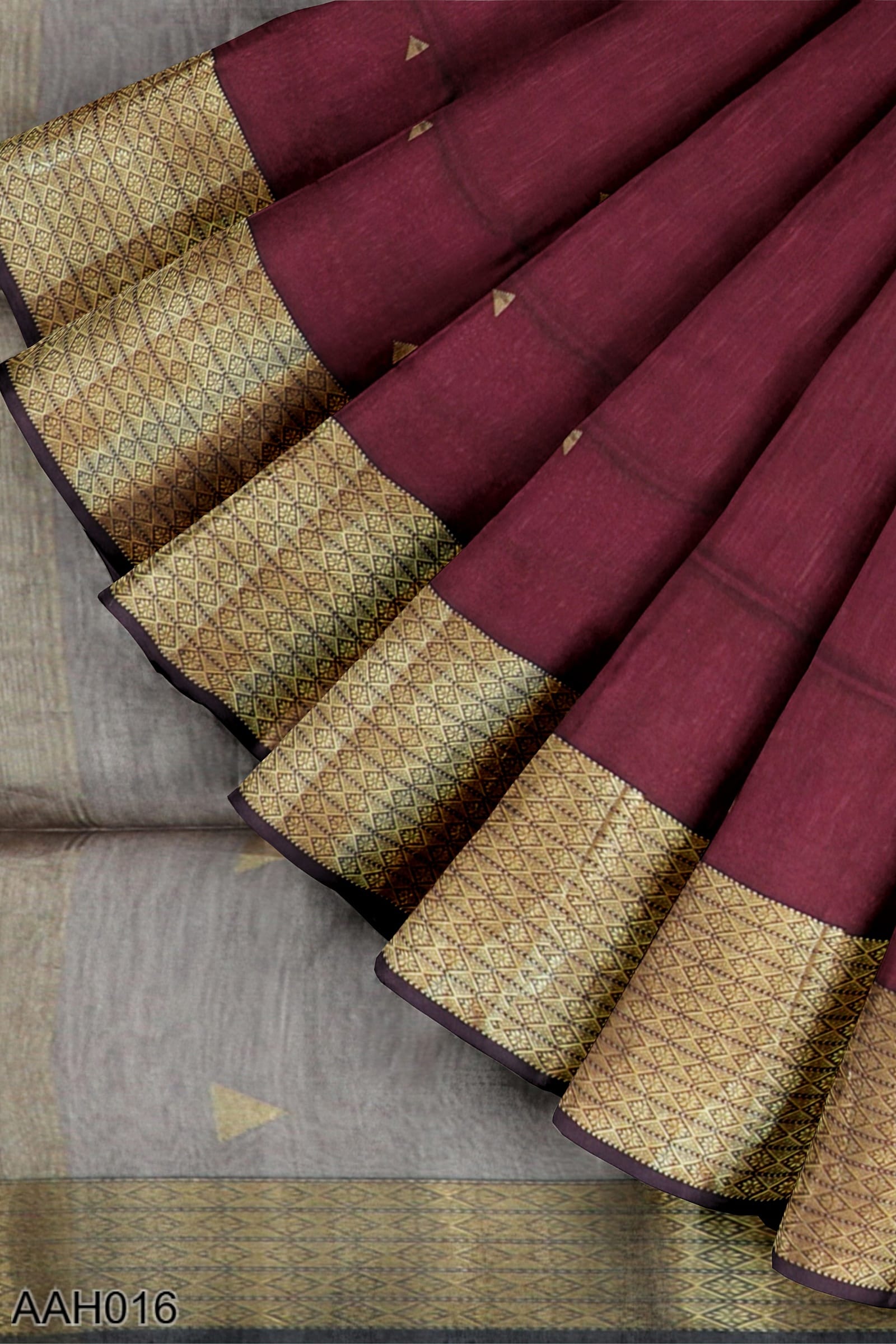 Amber-hued saree with triangle buta motifs and a Rui Phool skirt border. The contrast pallu is clear, while the blouse is plain for ease. A saree that holds its shape with confidence — great for religious gatherings, family lunches, or easy festive moments.