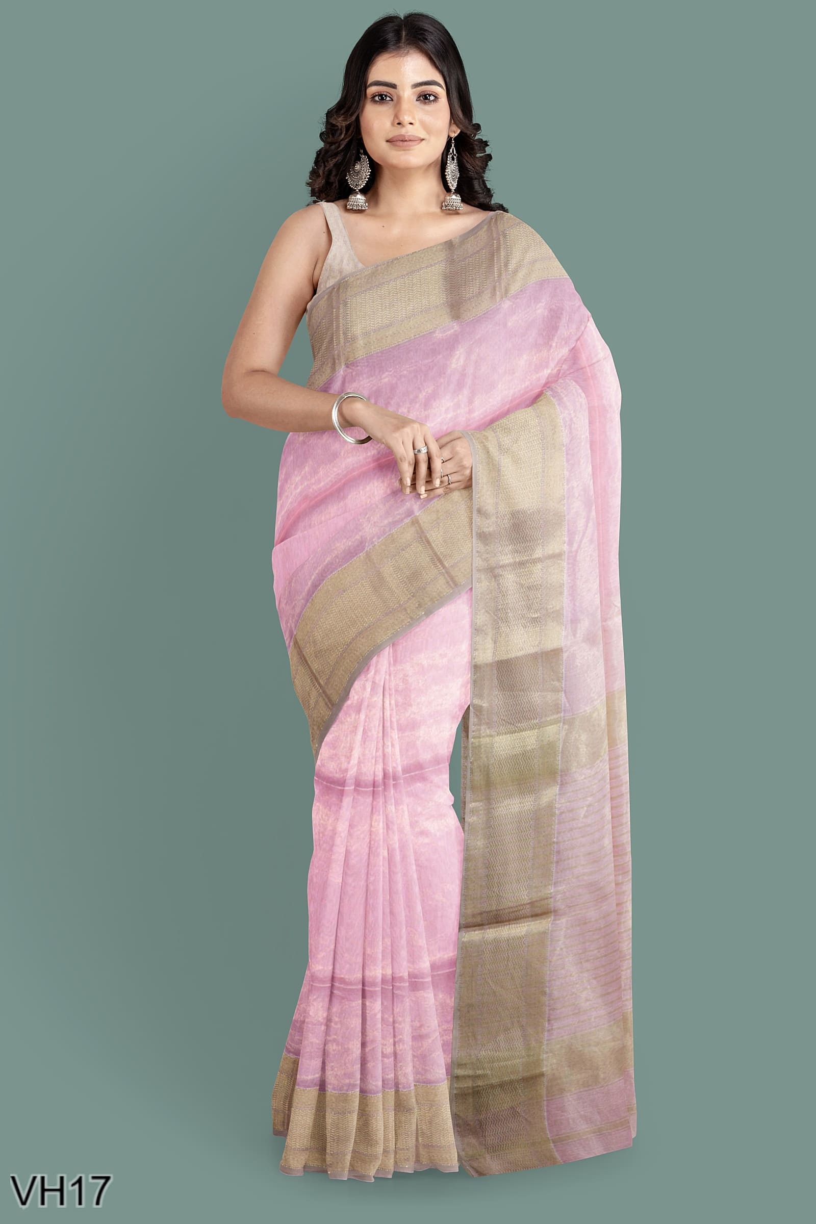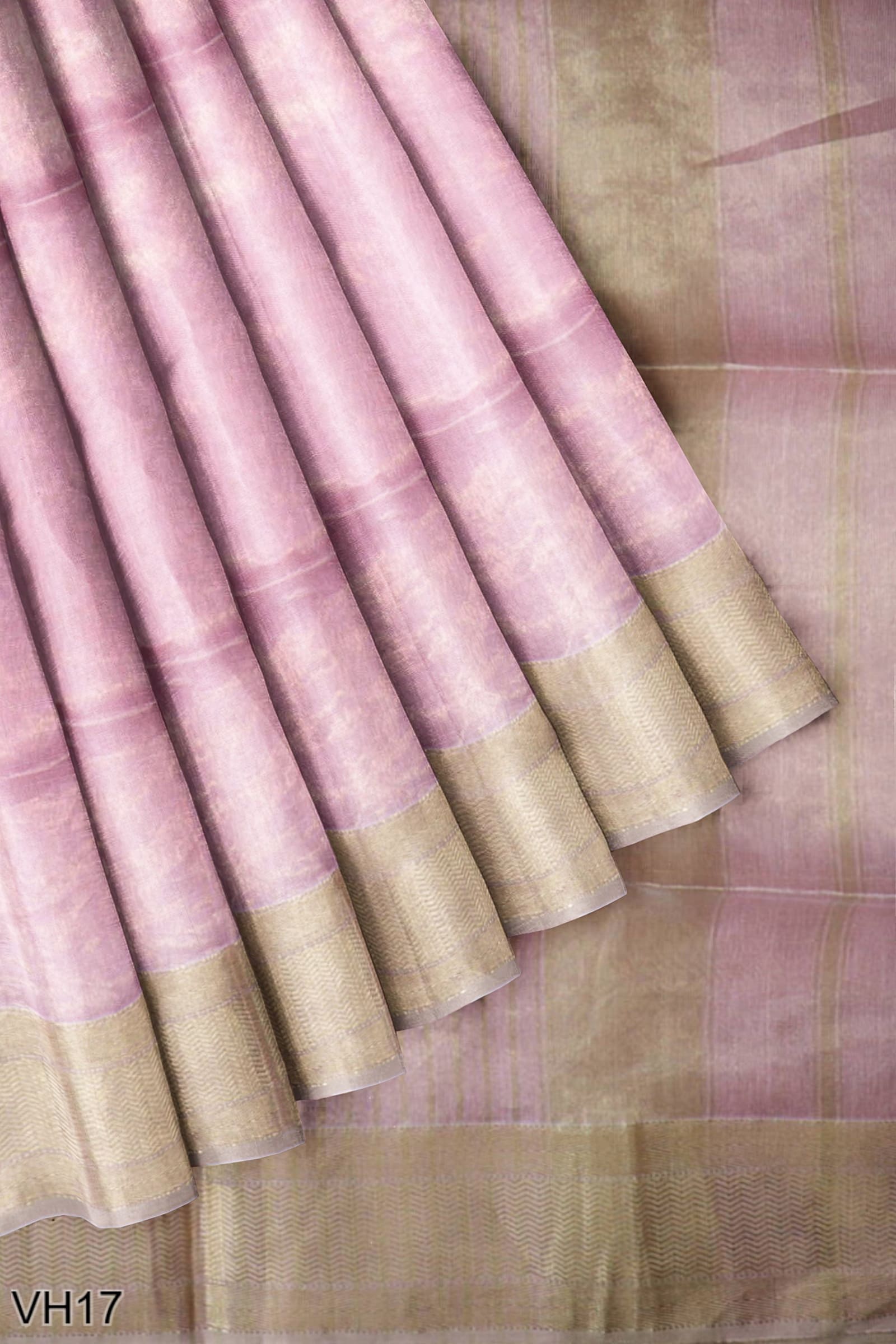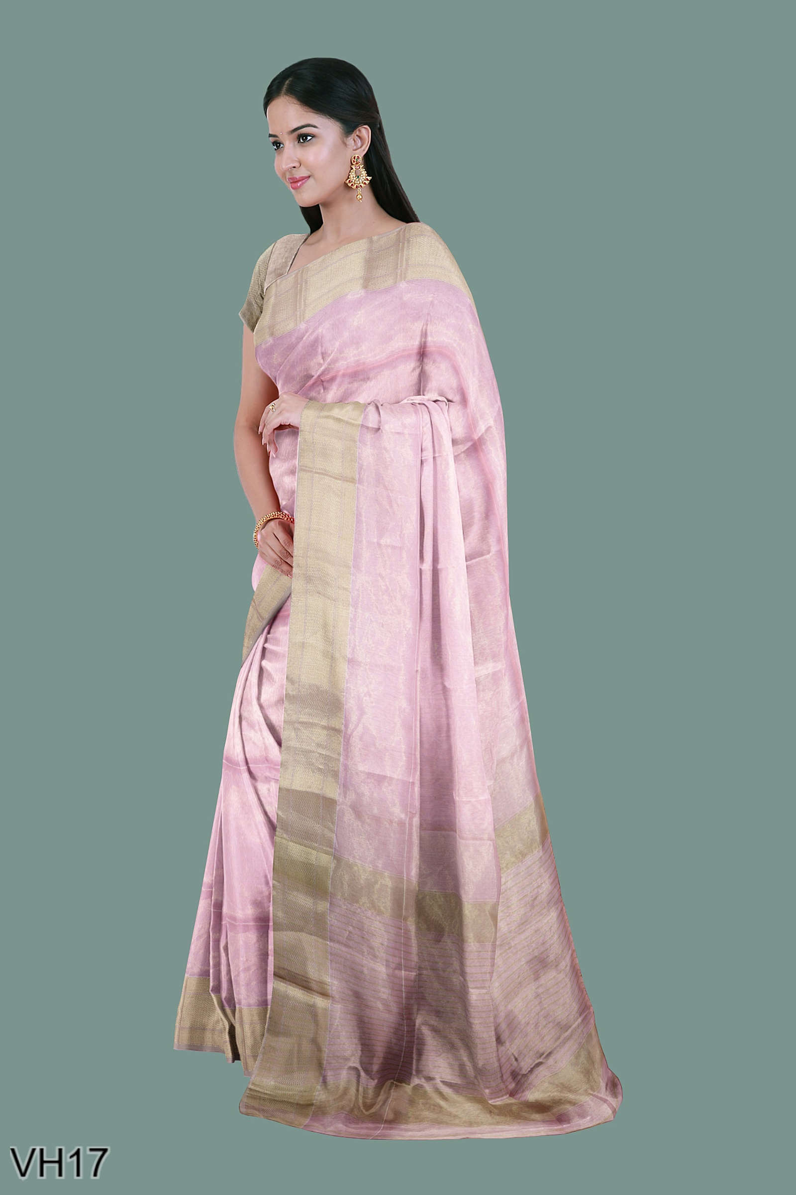 Woven in tissue silk, this twisted pink saree has a muted shimmer and delicate zari work. Paired with a golden contrast blouse, it’s a refined pick for evening rituals, bridal gifting, or subtle festive wear.